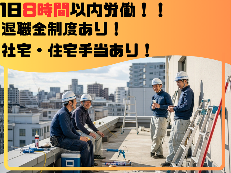 仕事内容 ◎求人のポイント!!! ✅1日8時間以内の就業時間! ✅週休2日制!(日曜、祝日休み) ✅平日休みも相談可能! ✅扶養家族手当あり! ✅役職手当あり! ☆主な仕事内容☆ ✅シーリング作業: 新築の建物にシーリングを打ち込む作業や マンションや戸建ての傷んだ シーリング材を打ち変える作業 ✅防水施工作業: 建物の屋上などで防水材を使って 雨水の侵入を防ぐために行う作業 ・アスファルト防水 ・ウレタン防水 ・シート防水など ≪改修工事について≫ 高経年マンションの質や価値を 長持ちさせていくため <改修工事>を行い、 環境の回復に加え マンションの資産価値を高めます。 ≪防水施工作業について≫ 防水施工作業は、 建物の寿命を延ばすため 外壁内部の防水シートの 破損を早期発見し 早めに対処することが必要となります。 ☆-☆ 1日の流れ 8:25~ 出社 現場集合 8:30~ 朝礼 9:00~ シーリング作業開始 10:00~ 休憩 11:00~ シーリング作業再開 17:00 退勤 ※出社は現場により 現地集合・全員で移動が ございます。 ※休憩時間は 作業進行度により変動 (10時~15時の間で1時間) ☆-☆ 現場の状況によって残業は少な目です!