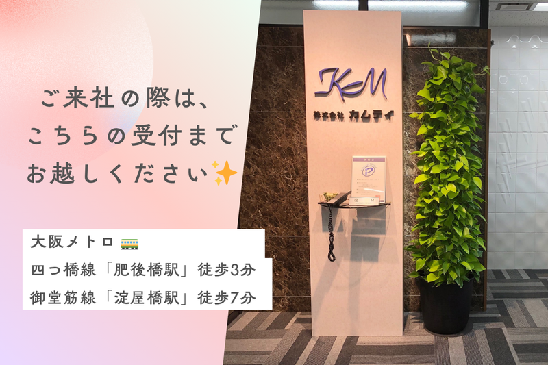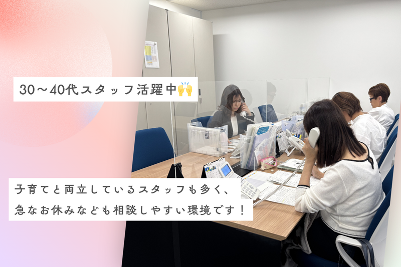 仕事内容 「久しぶりのお仕事復帰も大歓迎」 テレアポ経験はあるけど、 ・ノルマがきつかった ・人間関係がしんどかった そんな方にぴったりのお仕事です。 今回お願いするのは、 人材紹介事業・不動産事業を扱っている 弊社で“売り込む営業”ではなく、 企業様へ簡単な確認やご案内のお電話です。 【具体的には…】 ①企業様へ採用(人材不足等)のお悩みがないかお伺いする ②不動産業者様へ空き物件や空き土地がないか情報を引き出していただく ①②のうち、一つの業務をお任せいたします! 面接時にご希望等をお伺いして、決定する予定です♪ <求人のポイント> ■交通費全額支給!! ■1日5時間&10時スタートで働きやすい♪ ■ノルマなし!自分のペースでできる。 ※1日平均架電数:103件(不動産)、100件(人材) \安心して働けるポイント/ ・ノルマなし ・マニュアル完備 → 入社時研修もあり サポート体制充実 ・法人対応なのでクレームほぼなし ・頑張りに応じてインセンティブあり(任意) 現在は30〜40代のスタッフが中心に活躍中。 子育てと両立している方も多く、 急なお休みなども相談しやすい環境です。 <スタッフからの声> 以前はコールセンターで働いていました。 カムテイは少数精鋭。 架電件数ノルマはなく自分のペースで電話できます。 不動産業者さんに空き物件情報を聞いたり、 企業の採用担当者様から人材不足のお悩みを聞いたり。 売り込むお仕事ではないのでお客様もお話していただきやすいです。 聞けた情報は営業さんにパスアップ。 営業さんが契約につながるとインセン発生するので やりがいがあります。 スタッフ同士でうまくお話が聞けたトーク内容などを 教え合ったりしています。 10時~15時45分までの仕事なので子育てとの両立もしやすいです! オフィスは本町・肥後橋から徒歩圏内。交通費全額支給もうれしいポイント♪ 近くにスーパーもありおしゃれなカフェも多く 仕事帰りにより道を楽しむことも♪