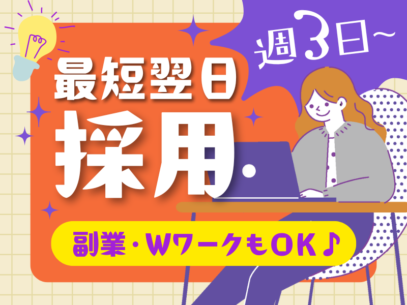 選考プロセス まずはお気軽にTELもしくは WEBよりご応募ください! ※TELの場合:06‐6335-9335 (平日10:00~20:00) ▼ 追って担当者より【当日~翌日以内】に 上記番号よりご連絡差し上げます! ▼ 電話面談(1回) ※履歴書不要、来社不要でOK ※お仕事により別途WEB面談あり ▼ 登録・採用 最短で翌日採用のスピード選考もOK! 応募から採用まで3~4営業日前後を予定しております。 一般労働者派遣事業 般27-301682