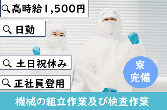 仕事内容 【高時給1500円】日勤専属の機械組立寮完備で東京に住めちゃう!プライベートも充実の土日祝休み◎夏はひんやり!冬はぽかぽか!空調完備の快適環境で働こう♪ <仕事内容> 半導体製造装置の製造業務に就いてもらいます。配属先は主に2つあります! (1)組立作業:電動ドライバー、インパクトレンチ等を使用。 ~組立作業は細かく分けて2つの工程があります~ 屋台組立:機械の骨組みを作る組立作業。 部品組立:機械の部品を作る組立作業。 (2)検査:完成品が正常に動くかマニュアルを見ながら確認。 常に同じ確認作業を行うわけではなく、様々な動作の確認を行います。 クリーンルーム内での作業なので清潔な職場です。 1つの工程を3~4人で作業するのでコミュニケーションが取りやすい環境です。 研修もあり丁寧に指導してくれますのでお仕事にブランクがある方でも安心して就業可能。 女性・男性どちらも活躍中!また、外国籍の方も活躍中!CDPスタッフも10名以上在籍で安心! ※頑張り次第で、派遣社員から直接雇用へのキャリアチェンジが出来ます。CDPから直接雇用になった方も多数います。 立ち作業でのお仕事です。 クリーンルーム内作業もございます。 個人作業・グループ作業どちらもございます。 《職場環境》 男女活躍中の職場です。 CDP派遣スタッフが在籍中です。 外国籍の方が活躍中です。 冷暖房完備です。 食堂完備 (1食250円~) ロッカー有り|休憩室完備 アピールポイント <仕事内容> 半導体製造装置の製造業務に就いてもらいます。配属先は主に2つあります! (1)組立作業:電動ドライバー、インパクトレンチ等を使用。 ~組立作業は細かく分けて2つの工程があります~ 屋台組立:機械の骨組みを作る組立作業。 部品組立:機械の部品を作る組立作業。 (2)検査:完成品が正常に動くかマニュアルを見ながら確認。 常に同じ確認作業を行うわけではなく、様々な動作の確認を行います。 クリーンルーム内での作業なので清潔な職場です。 1つの工程を3~4人で作業するのでコミュニケーションが取りやすい環境です。 研修もあり丁寧に指導してくれますのでお仕事にブランクがある方でも安心して就業可能。 女性・男性どちらも活躍中!また、外国籍の方も活躍中!CDPスタッフも10名以上在籍で安心! ※頑張り次第で、派遣社員から直接雇用へのキャリアチェンジが出来ます。CDPから直接雇用になった方も多数います。 立ち作業でのお仕事です。 クリーンルーム内作業もございます。 個人作業・グループ作業どちらもございます。 《職場環境》 男女活躍中の職場です。 CDP派遣スタッフが在籍中です。 外国籍の方が活躍中です。 冷暖房完備です。 食堂完備 (1食250円~) ロッカー有り|休憩室完備 \充実した福利厚生/ ◎社会保険・雇用保険完備 ◎有給休暇有(6ヶ月経過後、10日付与)※規定あり ◎残業手当 ◎交通費支給(規定内) ◎確定拠出年金制度 ◎週払い制度(週3回対応) ◎お友達推薦制度あり(規定有り) ※1名につき3万円~10万円臨時給与として支給 ◎正社員登用制度あり ◎寮完備 ◎制服貸与 ◎冷暖房完備で快適に働けます! ◎社員食堂あり(1食250円~) ◎食事持参可 ◎ロッカー・休憩室利用可 ◎福利厚生プログラム (宿泊、グルメ、ショッピングなど大幅割引が受けられる10万アイテムのメニューがあります。) お友達同士のご応募もお待ちしております!!
