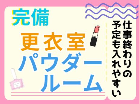 職場環境 【従業員構成】 *20代~40代前半までの男女活躍中 *更衣室やオシャレなパウダールームあり♪ *最新設備の綺麗な工場 *空調完備で一年中快適にお仕事可能 【職場の雰囲気】 お客様との対話は少ない 初心者活躍中 力仕事が少ない 決められた時間できっちり 知識、経験不要