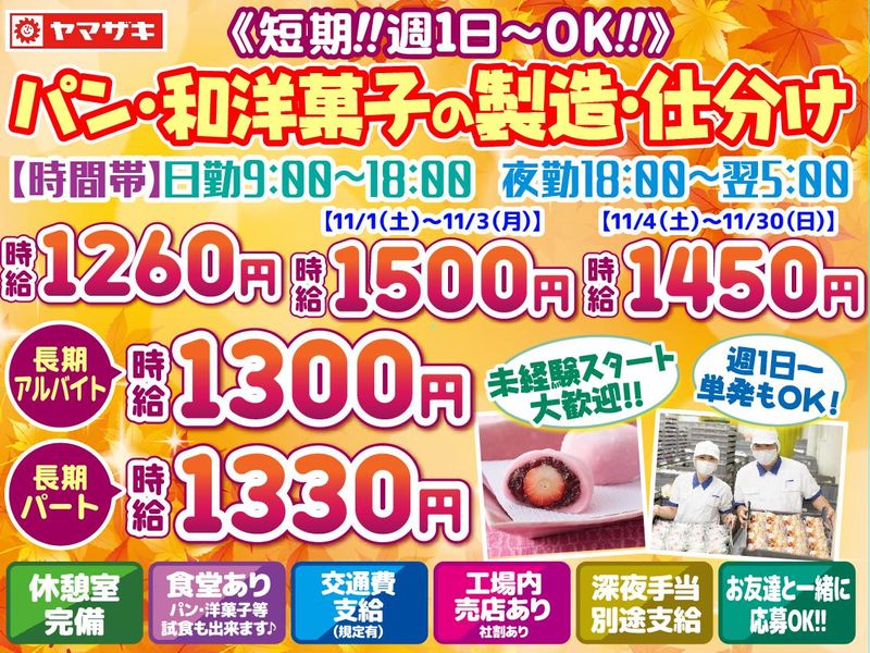 【保険制度】 雇用保険、労災保険 待遇・福利厚生 ※適用されない社会保険がある理由:雇用日数が不足している為 【福利厚生】 ✅制服貸与 ✅交通費規定支給 ✅食堂有(日替り363円~!夜食もあり) ✅食堂でのパン・和洋菓子試食あり ✅休憩室完備 ✅工場内売店有(社割あり)