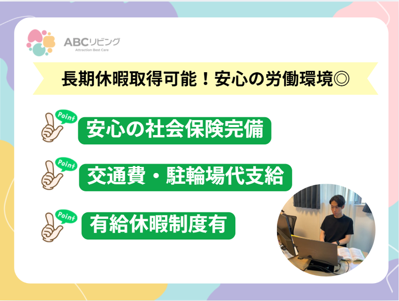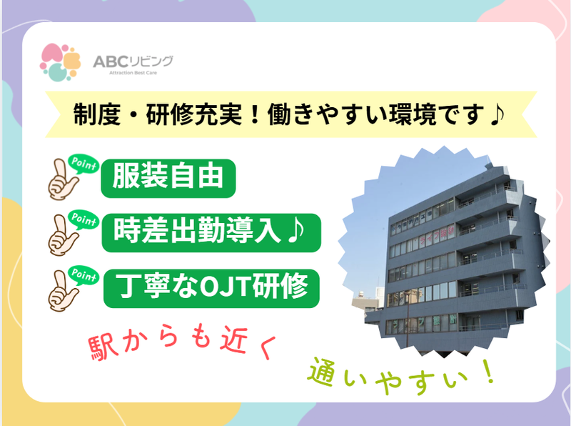 仕事内容 【労務の実務経験3年以上の方募集】 〈 スタートアップ企業本社 〉 〈 年休126日・フレックスOK 〉 ━━━━━━━━━━━━━━━━━ スタートアップ企業本社で 総務経験3年以上の即戦力募集✨ ━━━━━━━━v━━━━━━━━ 安定の介護業界大手のグループ企業が基盤。 当社は創業2023年の 急成長中のスタートアップ企業です! 今後の更なる事業拡大と成長のために。 新メンバーを増員募集決定! 8月に「田端駅」より徒歩4分の好立地へ 移転したばかり! 一緒に事業を作る楽しさも味わえる! *** ━━━━━━━━━━━━━━━━━ 今の時代にあった自由な働き方を✨ ━━━━━━━━v━━━━━━━━ ✅ 時差出勤を導入中! ✅ 年間休日126日 ✅ 土日祝休みの完全週休2日制 ✅ 服装自由 仕事ばかりでプライベートが… そんな時代や考え方はもう古い! 私生活が充実するから仕事も充実できる。 自分の未来を良くする1歩を踏み出す あなたの背中を必ず後押しします◎ *** *★⸜ ステップアップに! ⸝★* 本社の労務部門で新メンバー即戦力を募集  ̄ ̄V ̄ ̄ ̄ ̄ ̄ ̄ ̄ ̄ ̄ ̄ ̄ ̄ ̄✿* ̄ ̄ 医療・介護施設を全国に展開中の企業にて 労務部門チームの内勤スタッフを募集! ※業界未経験者歓迎 ▼【必須経験】 労務の3年以上の実務経験者 【優遇経験※必須ではございません】 マネジメント経験/労務関係のシステム導入経験 介護・医療業界の経験はなくても大丈夫! 入社時に丁寧なOJT研修があるので安心してスタートできます◎ ☆先輩社員(社労士資格保有のベテラン社員が在籍)が担当いたします☆ ▼具体的な業務内容 ・医療・介護施設を展開する人事部労務チームにて、労務メンバーを募集。 ・労務業務の内製化やデジタル化に向けた運用設計やシステム選定、フロー構築、ルーティン業務型化までお任せ予定です。 ・給与・賞与計算(マネーフォワード給与を導入・構築中) ・給与変更/人事・従業員情報管理(smartHRを導入・構築中) ・入社・退社・休職手続き/社会保険・雇用保険関係の管理(社労士と連携) ・勤怠確認・締め作業(キングオブタイムを使用)/労災対応/退職金制度管理(はぐくみ企業年金を使用) ・その他、付随する人事労務業務※上長,労務スタッフ・顧問社労士と一緒に相談しながら業務を進めて頂けます など 全国に新施設を展開中の企業。 現場の従業員の働き易さは本社の従業員の 業務に支えられています! 労務はまさにその核となるポジション。 業界問わず経験を活かして 次のステップへ挑戦する方を応援します! 先輩社員(社労士資格保有のベテラン社員が在籍)がOJTを担当 / ABCリビングとは?? \ 【ビジョン】 「生きる」のに困らない社会を実現する 【ミッション】 より良く「生きる」ことに寄り添う 【経営理念】 仕事を楽しみ、人生を楽しむ そして社会から必要とされる 人間であり会社となる。 特別な支援が必要な方も支援の必要ない方も 平等に「生きる」上で困らない世界の 実現の為、新施設の展開を行っています! ご利用者様も働く従業員も 当施設と出会ったことで、日常を生きる事が より楽しくなる。 そんな会社であり続ける為に、 共に創る仲間を新たに募集しています!