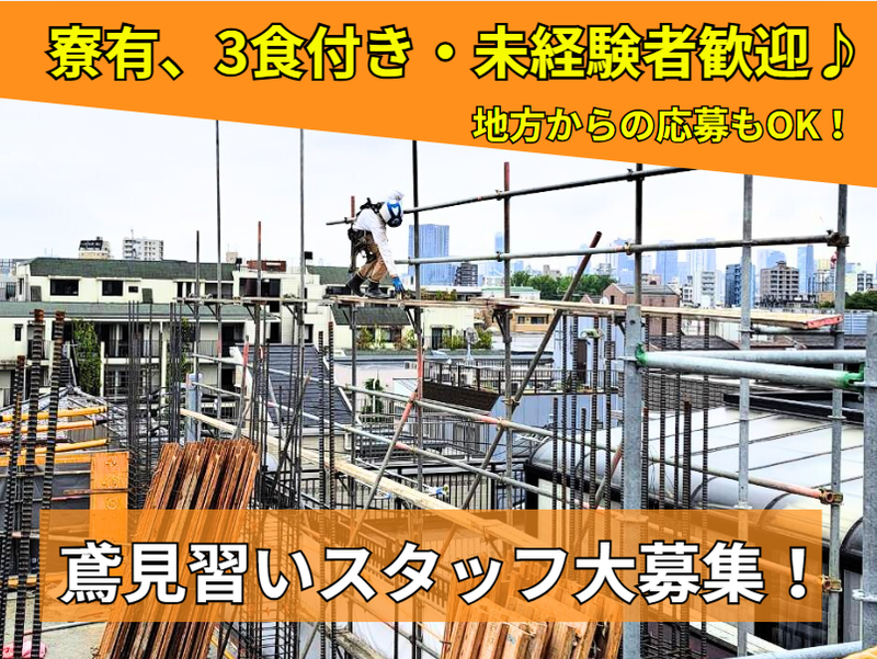 仕事内容 ✨♦°˖⭐°˖✨♦°˖⭐°˖✧✨♦°˖⭐°˖✧ 【求人のポイント】 ●寮完備&3食付きで1日2,500円! ●10日稼働後に給与日 ●鳶見習いで日給1万4000円以上 ✨♦°˖⭐°˖✨♦°˖⭐°˖✧✨♦°˖⭐°˖✧ 新築マンションや新築倉庫の建設現場にて、 鳶工事を担当する職人さんを募集します! ゼネコン各社様より一次下請けで安定の仕事量 主に仮囲い、外部内部足場、ロングスパンエレベーター、 タワークレーンの組立解体作業になります。 現場の立ち上がり段階からいち早く入り、 基礎工事に携わる重要なポジションです。 高い技術と職人としての経験が、そのまま現場を支える力になる――。 建物の“土台”をつくるこの仕事は、まさに現場のスタートを担う存在。 職人としての経験が大きな武器になります。 「本物の技術で、次の現場も任される仕事をしたい」 ――そんな誇りを持った方のご応募をお待ちしています。 □■□■□■□■□■□■□■□■□■□■ ✨「住む・食べる・働く」全部ここで完結!✨ ◎寮完備&3食付きで1日2,500円! 衣食住すべて揃っているから、生活面の不安なく仕事に集中できます。 地方からの応募も大歓迎です♪ □■□■□■□■□■□■□■□■□■□■ ⭐山中建設株式会社について⭐ マンションや福祉施設、倉庫、工場などの建設工事に欠かすことのできない 足場架設・土工事・コンクリート工事を事業とし、 おかげさまで2022年5月で創業45周年を迎えました♪
