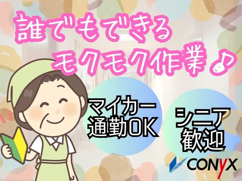 【仕事内容】 \月水金の午後2時間/ ⭕扶養内・未経験OK ⭕マイカー通勤OK ⭕シニア活躍中 【主なお仕事内容】 ✅日常清掃 ✅トイレ清掃 ✅シャワー室清掃 など、 家事の延長で出来るモクモク作業♪ 難しい作業、機械の操作はありません! 未経験の方も始めやすい軽作業です。 ===================== 手厚いサポートや体制が自慢です ===================== 創業70年以上のコニックスだからこそ、 働くスタッフへのフォロー体制が充実しています。 ⭐充実・安心の研修制度 丁寧な研修で覚えれるまでしっかりとサポートします。 未経験の方もご安心ください! 掃除のコツ、身に付きます! ⭐働きやすい安心フォロー体制 もし困ったことが起きたときは、 担当スタッフがすぐにフォローする体制があります。 お休みを取りたい時は、 サポートのスタッフが替わりに入りますので、 安心して仕事ができる環境ですよ! ===================== ⭐まずはご相談からでも、お気軽にお問い合わせください! 【求人ID-MDR15A】