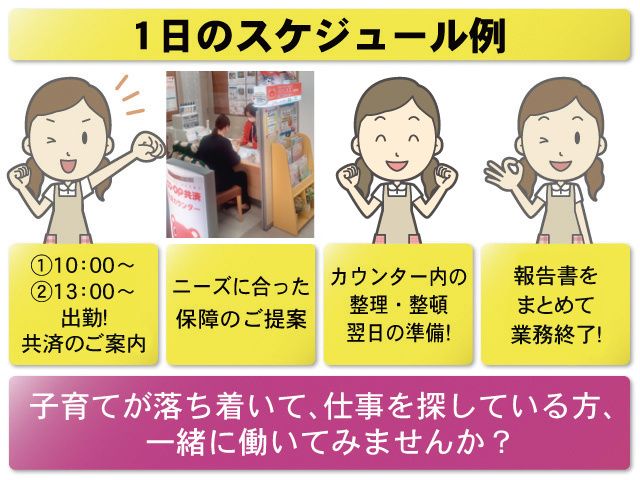 仕事内容 【扶養内勤務OK】 プライベート重視派におすすめ! ・選べる勤務時間 午前からor午後からで 1日4時間の短時間勤務! ・基本土日祝休み そのほか、平日休みもあるので 月の約半分がお休みになります! 30代・40代・50代の 子育てがひと段落して復帰された 主婦(夫)さんが多数活躍しています! 【お仕事内容】 みやぎ生協の南小泉店にて、 組合員さんへコープ共済のご案内をお願いします。 興味を持たれた組合員さんには 契約までの対応も行います。 また、既にご契約されているお客様からの お問合せ・ご相談等もございます。 <ご案内するコープ共済って…?> 掛金がお手頃で、保障が手厚いのが特徴! ほとんどのコープ組合員の方にご加入いただいており 大変満足度が高いのでご案内しやすく、 安心しておススメできます! <お仕事の流れをご紹介!> ①来店された組合員さんへコープ共済をご案内 ②組合員さんのニーズにあった保障をご提案 ③共済カウンターの整理整頓など ④一日の終わりに報告書をまとめて業務終了! <このお仕事のやりがいは…?> 組合員さんのお悩みに対して CO・OP共済でなにができるかを考えて提案いたします。 ご契約をいただいた組合員さんに、 「けがをした時や入院した時にとても助かりました」と 声を掛けてもらえることがとても嬉しい瞬間です! 【充実の研修制度あり】 未経験の方でも安心して働けます! 慣れるまでしっかりサポートしますので 初めてで不安な方もご安心くださいね! 研修中でも変動なく給与を支給します! ・座学研修(入社後1~2週間) ↓ ・現場で先輩社員とOJT研修(1ヶ月) ↓ ・店舗配属後はマネージャーのフォローあり! 【子育て世代活躍中】 急な事情でのお休みにも対応可能! お子さんの熱や行事などでも理解のある職場です。 上司のサポートもあり、 経験のある先輩にも相談しやすい環境です! 「子どもが大きくなったからフルタイムで働きたい」 そんな方はフルへの切り替えも可能! お気軽にご相談ください! 【こんな方におすすめ】 ・法人営業、個人営業、ルート営業の経験がある ・生命保険などの知識がある ・人と話すことが好き ・長く働ける職場が良い ・短時間でサクッと働きたい など 正社員・アルバイト・パートなど 前職の雇用形態や勤務経験は問いません! ご応募お待ちしております! 【商品について】 病気やケガなど、「もしも」のことが起きた際に 共済金をお支払いする「CO・OP共済」 「CO・OP共済」は、1984年の事業開始以来、 40年以上にわたり全国の生協と力を合わせてきた結果、 970万人(2022年度末時点)の組合員やそのご家族にご加入いただき、 「大手4共済」の一つに数えられる規模にまで成長。 私たちは「CO・OP共済」という保障商品を通して 組合員のくらしに安心をお届けしています。