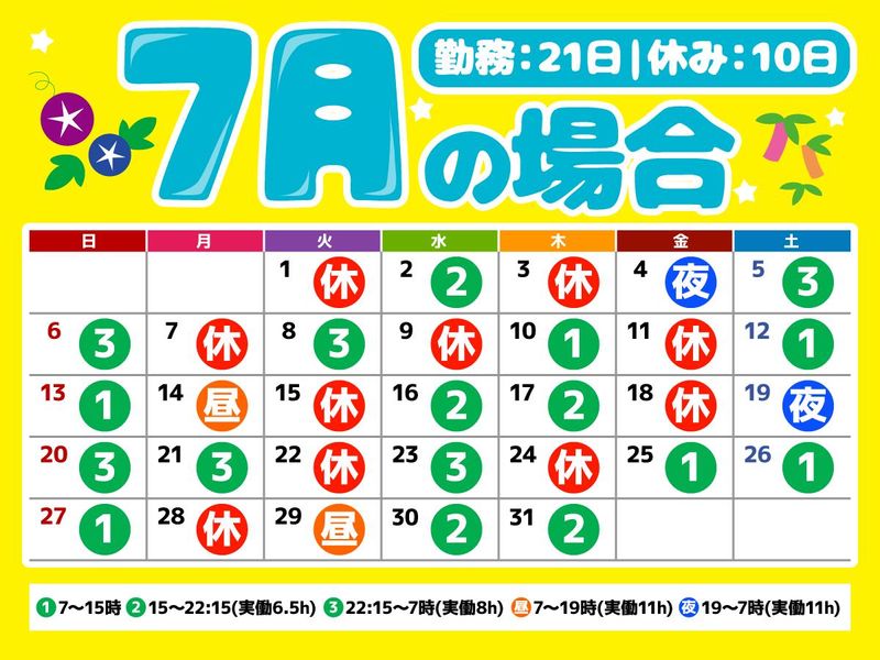 シフト制 勤務時間詳細 実働時間:1日あたり6時間8分 平均勤務日数:1ヶ月あたり23日 ① 7:00~15:00 (実働7.25h) ② 15:00~22:15 (実働6.5h) ③ 22:15~7:00 (実働8h) 昼 7:00~19:00 (実働11h) 夜 19:00~7:00 (実働11h) ※上記時間帯内で交替勤務 希望で3連休も可。 交替勤務なら、日勤より稼げて夜勤専属より無理な働き方をしなくて良いので、両者の良いとこどり! 月3日ごとに希望の日にちで休みを取れます! 有給休暇の消化も積極的に推奨しております。