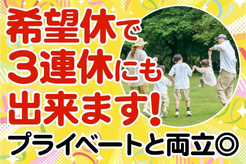 休日休暇 週休2日制(シフト) ✅未経験からスタートできる仕事 簡単&単純作業!未経験から始めても、2か月あればすんなり仕事がこなせるように◎ ✅働きやすい工夫しています! ・希望休みが取れる(公休と合わせて3連休等もOK♪) ・突発的な夜勤や残業なし ※人員不足などシフト構成から前もって予測できるので急に残業になることはありません。 ■夜勤経験がない方は最初は生活リズムに戸惑うかもしれませんが、希望休みが取れますし最初のうちは負担のないように周りがサポートしますから安心してくださいね!