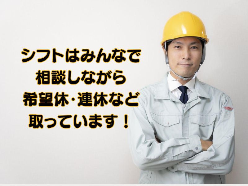 勤務時間詳細 実働時間:1日あたり7時間 平均勤務日数:1ヶ月あたり22日 <3交替勤務> (1)7:00~15:00(2)15:00~23:00(3)23:00~翌7:00 ※実働7時間、休憩60分 ※前月に次月のシフトを決めています(希望休の相談しやすい環境です) ※活躍中の先輩は「旅行に行きたいから」という理由で連休を取ったりしています! ※「日勤多め」「稼ぎたいから夜勤多め」など、相談し合いながらシフトを決定しています♪
