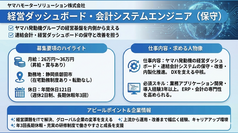 アピールポイント: ✨経営課題をITで解決し、グローバル企業の変革を支えるやりがいあるポジション ✨ヤマハ発動機のDXを支える中核として、ERP・会計の専門性を高めながらキャリアアップできる環境 ✨上流から運用・改善まで幅広く経験でき、要件定義やベンダー対応にも挑戦可能 ✨年3回・9日前後の長期休暇など高水準の休日制度で、計画的な休暇取得を推進 ✨教育・研修・資格支援制度が充実しており、長期的なスキルアップを後押しする制度