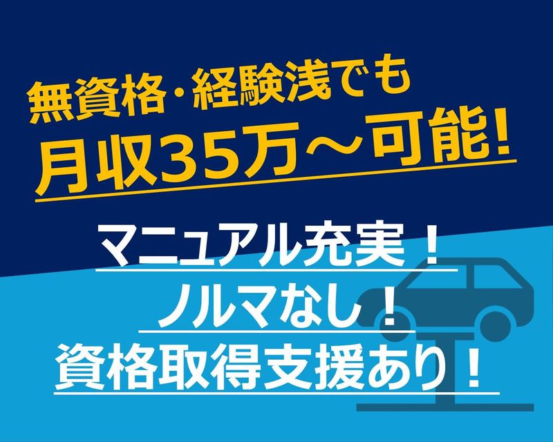 求めている人材 <必須条件> ・整備の実務経験(経験年数不問) ※整備士資格はなくてもOK! ※経験が浅くても大丈夫です! 工具と部品の名前がわかれば 問題ありません! <歓迎条件> ・色々なメーカーの車の整備がしたい ・ノルマに追われず丁寧な仕事がしたい ・正社員デビュー、第二新卒の方も ぜひご応募ください! ◆中卒・高卒OK!学歴不問! ◆資格取得支援制度あり! 無資格で応募OK! 資格なしで入社した10名以上の社員が 整備士資格を取得しています! ◎資格や経験により、 給与・待遇を考慮します