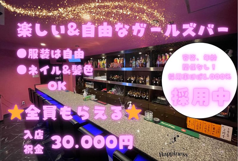仕事内容 カウンター越しでの接客のみ! 一緒に飲んだり、会話したり、ゲームしたり・・・お客様と楽しい時間を過ごして下さい! カジュアルな私服で勤務OK!デニム・スニーカーもOK! 「ワンピース」や「キレイめコーデ」、「ヒール必須」などの縛りはなく、好きな服・動きやすい服・お肌やボディラインを隠せる服などで自由にコーデできます! ジャージやスウェットといったダル着に見える服装以外ならOKなので、お仕事のために衣装を買い揃える必要はありません。 未経験スタートでも安心&稼げる! 初心者さんも初期費用ゼロ! キャッチ無し! ビラ配り無し! ノルマ無し! ストレス無し! 時給+最大80%バック! 現在活躍中の先輩キャストさんは、9割以上がナイトワーク未経験からのスタート! お酒の知識や夜職ならではの専門用語、接客マナーなどは入店してからゆっくり少しずつ覚えていけば大丈夫! ノンアルコールドリンクも揃っているので、お酒が飲めない方も問題なく稼げる環境が整っています。 もちろん経験者さんには多彩なメリットをご用意し、これまでのお仕事経験や実力をしっかりプラス評価した上での待遇をご提案可能です! *体験入店は複数回OK 初挑戦の方も移籍検討中の方も、ぜひじっくりお店の魅力を確かめてみてくださいね!