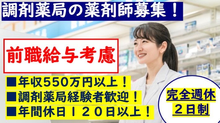 【アピールポイント】 調剤薬局の薬剤師募集! ■前職給与考慮します! ■経験者歓迎! ■完全週休2日制! ■年間休日120日以上!