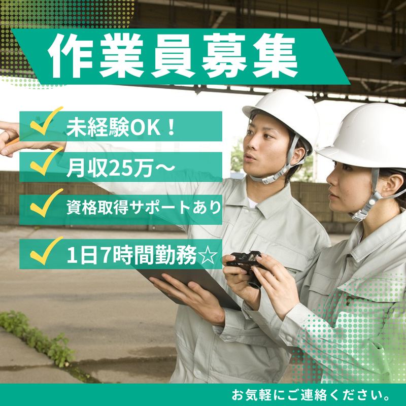 仕事内容 ★未経験OK◎ ★月収25万円~♪ ★資格取得サポートあり☆ ★1日7時間勤務♪ 《オススメポイント》 1)未経験OK♪♪  ̄ ̄ ̄ ̄ ̄ ̄ ̄ ̄ ̄ ̄ ̄ ̄ 業界未経験やブランクのある方も しっかりフォロー体制があるため 安心☆ 現在働いている方も別業種から 来ている人も多いです! 2)月収25万~♪  ̄ ̄ ̄ ̄ ̄ ̄ ̄ ̄ ̄ ̄ ̄ ̄ 月給制なので、収入も安定☆ しかも、25万円スタートなので 他の職種と比べても高収入♪ 3か月ごとに昇給チャンスもあるので、 どんどん収入アップしていくのも魅力☆ 3)資格取得サポートあり☆  ̄ ̄ ̄ ̄ ̄ ̄ ̄ ̄ ̄ ̄ ̄ ̄ 資格取得サポートもあるので、 資格持っていないけど大丈夫かな という所も心配なし☆ 3)1日7時間勤務☆  ̄ ̄ ̄ ̄ ̄ ̄ ̄ ̄ ̄ ̄ ̄ ̄ 1日7時間勤務で、17時にはお仕事終わるので ワークライフバランスも安定☆ 早く終わったら家庭の時間に使ったり 趣味や遊びの時間に使う事も可能です☆ 【主な仕事内容】 ✅改修工事に伴う非破壊検査(撮影にはX線を使用します) ✅新築、改修工事の際、コアマシンを使用しコンクリート等に穴をあけます。(ダイヤモンドコア穿孔) ✅養生・清掃等の軽作業 ※難しく感じるかもしれませんがしっかりとフォローしますので、未経験でも大丈夫です!!! 【今回の募集について】 ⭐⭐今回は大手建設会社からの業績好調により、増員での募集となります!⭐⭐ ✅業界未経験やブランクのある方でもしっかりフォローしていきますので、安心して就業できます。(過去実績あり) ✅作業ブランクがあり、体力に自信がない方でもお気軽にご相談下さい!!! ✅事務所に集まってみんなで現場に行きますが、直行直帰も相談可能です☆ 【私たちの会社はこんなことやっています】 私たちは非破壊検査・ダイヤモンドコア・設備所工事を行っています。 ダイヤモンドコアとは?⏩エックス線発生装置機という特殊な機械でコンクリートの中を調査し、コアドリルという機械を使って配管などの穴をあけていく作業の事です。 設備所工事とは?⏩主に新築現場にてインサート(天井アンカー)・スリーブの位置を図面で確認し墨出しを行い取り付けていく作業になります。 【従業員数】 正社員10 名 請負2名 計12名