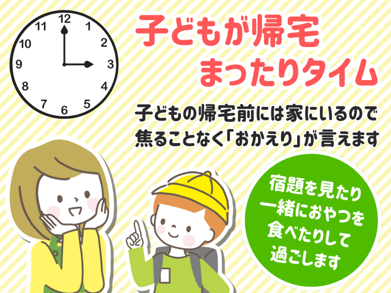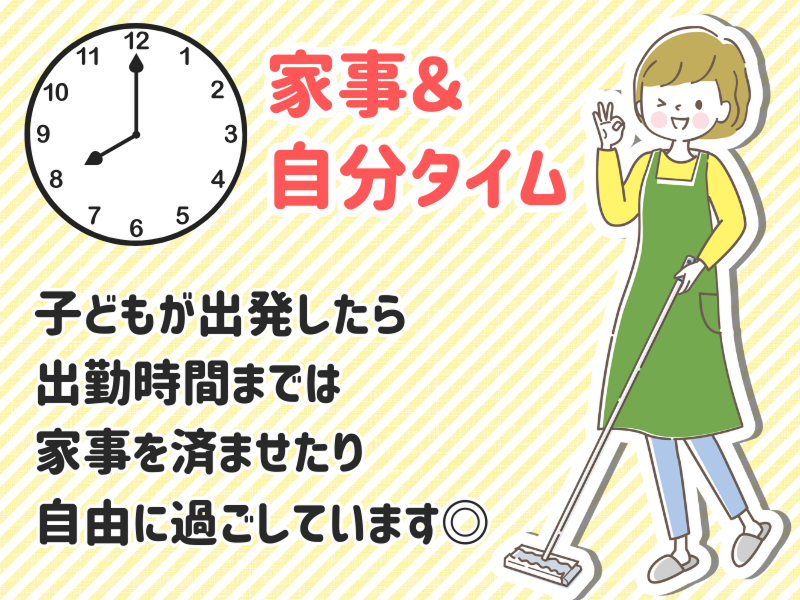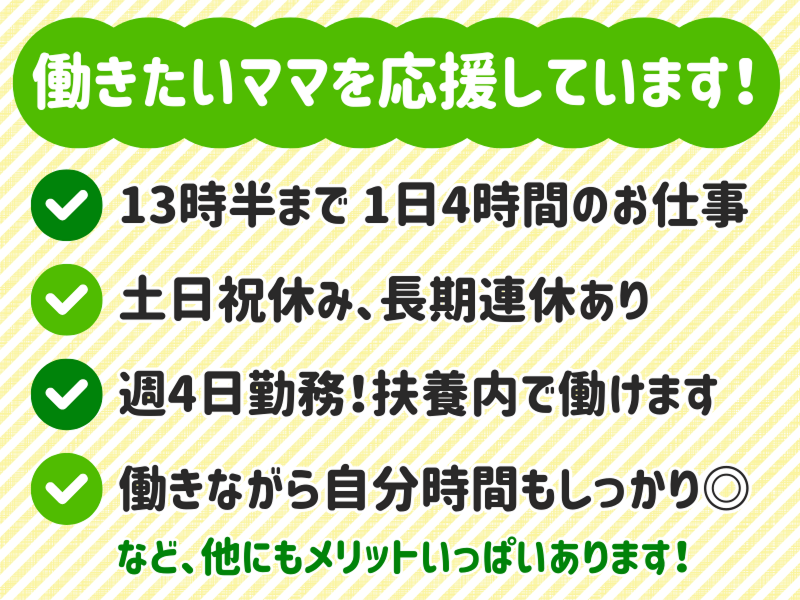 勤務時間詳細 9:30~13:30 ★週4日のシフト制 ※週3日勤務も可能です!ご相談ください。 ◇振替勤務も可能 お子さんの行事などにも100%参加して欲しいと考えています。 例えば「通常は水曜休みだけど、金曜日に行事があるから今週は金曜休みにする」なども◎ ◇急なお休みもOK お子さんの急な発熱などの場合はお休みも可能です。 お休みや勤務についての相談は、気軽にしてくださいね! - ▽ある一日の流れ 9:30 出勤 朝礼、当日行動の確認 9:40 センター(営業所)出発 10:00 活動地域到着、活動開始 ※途中で休憩も取ります。 13:20 センター(営業所)着 事務作業後、当日業務終了 / 13:30までなので子育てや 無理なく家事との両立にも ぴったりの勤務時間です◎ \ ※週20時間未満の勤務です
