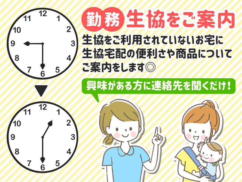 仕事内容 \働きたいママを応援しています!/ 9:30~13:30のお仕事だから お子さんが保育園や幼稚園、 小学校などへ行っている間だけ 働くことができます◎ 子育ても、お仕事も無理なく 両立して欲しいと思っているので 働き方の希望があれば ぜひ聞かせてくださいね! - ・。*このお仕事のポイント*。・  ̄ ̄ ̄ ̄ ̄ ̄ ̄ ̄ ̄ ̄ ̄ ̄ ̄ ̄ ̄ ̄ *平日のみ!土日祝休み *13:30までの勤務 *週4日勤務◎平日1日はフリー♪ *学校行事の日はお休みOK (振替勤務も可能です!) ▽お仕事内容 地域の方へ生協の広報・ご案内をする お仕事です。 ・宅配の便利さ ・生協商品の魅力 などを 担当地域のお宅に訪問して広報・ご案内 をお願いします。 あなたのお仕事は、関心をもってくれた 方の連絡先を聞くだけ! 詳細説明は専任の説明担当者へ 引継げばOK!細かな説明や 加入の手続きなどは行いません。 ◆一宮生協は生協連合会アイチョイス に加盟しており、アイチョイスの サービスについてご案内いただきます。 - ▽服装について スーツではなく、動きやすいポロシャツ、 上着、防寒着等を支給します! 動きやすいズボンと靴(スニーカー等) をご自身でご用意いただき、活動して 頂きます。スーツよりも温度調整が しやすく、機能的で、お客様とも 親しみやすい服装です◎ - \\働くママさん達に好評な理由!// ◆9:30始業 お子さんを送り出して、家事などを してから出勤する方多数!少しでも 1人時間ができて嬉しいとの声も。 ◆土日祝休み&長期休暇あり お子さんの休みに合わせられるので 周りにも気を遣わず働くことができます ◆週4日勤務 平日1日は自分だけのフリーな日が 作れます◎日々の息抜きや、他の日を 楽にするために食事のつくり置きを するなど、ゆったりできる日が1週間の 中で1日でもあると嬉しいですよね。 ◆高時給で扶養内勤務 時給は1300円ですが、しっかり 働いても、週4日、1日4時間の勤務 なので扶養内で収めることができます◎ - ◎未経験大歓迎!丁寧に教えます(^^) マニュアルがあるので、経験がない方 ブランクがある方でも大丈夫! 分からないことは何度でも聞いて下さい 「人と話すことが好き」 「以前営業職として働いていたので また同じような仕事がしたい」 そんなあなたにピッタリ♪ →入社5年未満のスタッフで 構成されている新しい部署! 家事や育児と両立する主婦さんが 大活躍しています! 私にできるか不安…というあなた! 大丈夫です◎しっかりサポートします。 初めは分からなくて当然ですよ! - 特別なスキルは必要なし◎ 「人と話すことが好き」 そんな方ならおすすめです◎ - 【主婦スタッフの声】 週4日の9時半スタートなので 朝 家族を見送った後、 家事を一通り終えてから仕事に行きます。 産後初めての仕事でしたが、 周りからのサポートもありすぐ慣れました◎ 子育て・家事のことなど 情報交換もできて楽しいです♪ 子供の急な体調不良の時も 相談がしやすくて助かっています。 - ◎アクセス 小牧営業所は… ・豊山町の豊山町役場~車で6分 ・岩倉市の岩倉駅~車で10分 ・春日井市の間内駅~車で11分 ・北名古屋市の西春駅~車で12分 ・小牧市の小牧駅~車で14分 無料駐車場完備! 車通勤もしやすい場所です◎