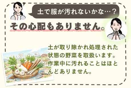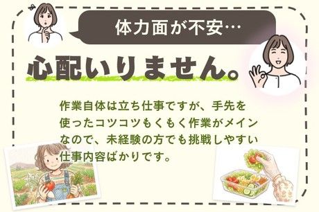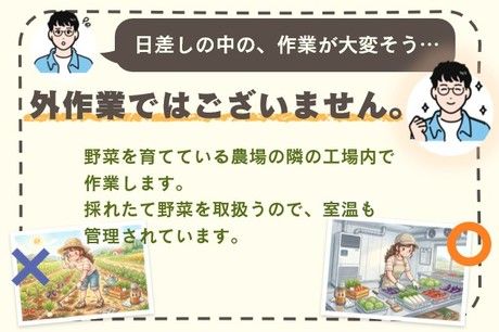 仕事内容 お野菜の検品や、容器へ盛り付け作業等をお願いします。 365日、お野菜を育てられる農場。 季節に関係なく、1年を通して野菜を作っている農場でのお仕事です。 管理された環境や室内栽培で「夏だけの農作業」ではなく、年間を通して安定して働けます。 天候に左右されにくいため出荷も安定しているおかげで、取引先も少しずつ増えてきました。 今よりも多くの採れた野菜を管理できるよう、工場を冷蔵保管庫へ改装工事中! これからの季節は、野菜がたくさん採れ繁忙期となる為、新しいスタッフを募集します。 <農作業に挑戦してみたい方必見!!>未経験から始められる農作業! 夏になるとよく見る農作業の求人。 ずっと気になっているけど、ちょっとした不安や心配があって挑戦できていない方いませんか? 例えば・・・ ■『体力面が不安…』 →心配いりません。 重量物がほとんどなく、手先を使うモクモク作業がメイン。 未経験の方やブランクさんが始めやすいお仕事内容です♪ ■『日差しの中の、作業が大変そう…』 →外作業ではありません! 野菜を育てている農場の隣の工場内で作業します。 採れたての野菜を取扱うので、室温も管理されています。 ■『土で服が汚れないかな…?』 →その心配もありません。 土が取り除かれ処理された状態の野菜を取扱います。 作業中に汚れることはほとんどありません。 今回お願いするのは、実際に野菜を育てている農場のすぐ横にある作業場でのお仕事です。 本格的な農作業は不安だけど、ちょっと挑戦してみたい方にぴったりですよ。 採れたて野菜の検品など 作業場の隣で採れた野菜の検品作業や盛り付け等のシンプル作業がメインです。 ■野菜に傷がないか目視で確認 ■出荷先ごとに紙の表を見ながら仕分け ■野菜を計量し、容器に入れる 等の手先を使ったコツコツもくもく作業をお願いします。