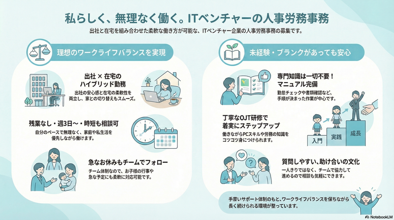 求める人材: 【必須条件】 ・なにかしらの事務経験 ・PCは基本の操作ができればOK。システムの使い方は働きながらコツコツ覚えていけば大丈夫です! 【あれば活かせるスキル】 ・勤怠・労務管理の実務経験 ・社会保険関連の書類作成や申請経験 ・人事システムの操作経験(例:HRMOS、freee、SmartHRなど) 【この仕事に向いている方】 ・プライベートと両立しながら働きたい方 ・誰かのサポートが好きな方 ・コミュニケーションを取ることが好きな方 ・一人で黙々よりもチームで助け合いながら働きたい方 ・お仕事復帰のため短時間から始めたい方
