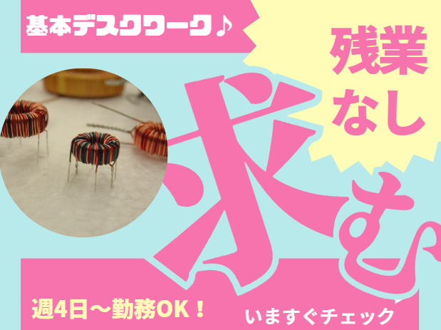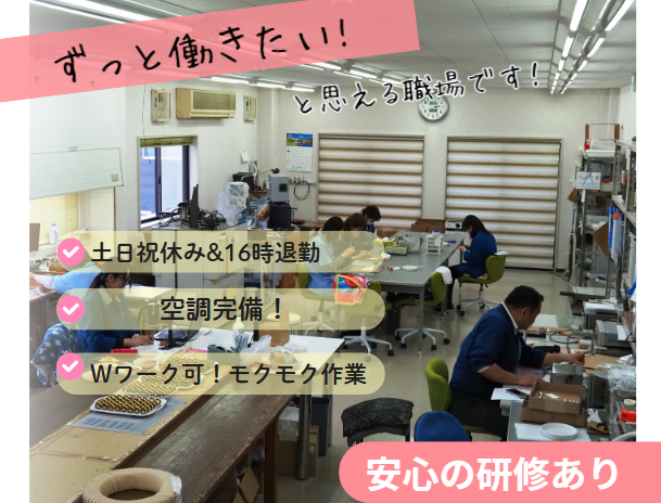仕事内容 ⭐主婦さん多数活躍中⭐ ⭐パートさんは全員女性スタッフです⭐ 居心地の良い”もくもく作業”のお仕事◎  ̄ ̄ ̄ ̄ ̄ ̄ ̄ ̄ ̄ ̄ ̄ ̄ ̄ ̄ ̄ ̄ ̄ ̄ 株式会社マイクロ電子は、 家電製品などに使われる 電子部品をつくる会社です。 「電子部品」「製造」と聞くと 専門的な知識や経験が必要なのでは!? と思う方も多いかもしれませんが、 今回募集している製造スタッフさんは 全員主婦さんなんですよ✧*。٩(ˊωˋ*)و✧*。 「子どもの行事」「急な発熱」 「家庭の予定」などにも柔軟に対応できる 環境だから、安心して 長く続けられる職場です♪ ◇・◇・◇・◇・◇・◇・◇・◇・◇・◇・◇・◇・◇ 【仕事内容】 電子部品(コイルなど)の 製作スタッフとして、 製造ラインでのお仕事をお任せします。 主に「巻き線」などの 細かい軽作業が中心です。 ✨コツコツ集中して 進めたい方にぴったり! ✨重たいものを持つ作業はほとんどなし! ✨わからないことは 先輩スタッフがフォロー! 未経験スタートの方が多数在籍。 慣れるまでは横でしっかり サポートしますのでご安心ください♪ ◇・◇・◇・◇・◇・◇・◇・◇・◇・◇・◇・◇・◇ 【1日の流れ(例)】 9:50 朝礼 10:00 作業スタート 12:00 お昼休憩(食堂あり) 13:00 午後の作業 14:30 15分休憩 14:45 作業再開 16:00 退勤(お疲れさまでした!) 家事・育児のスキマ時間で働ける、 家庭と両立しやすい時間帯です。 そのため、現在の製造スタッフは 主婦さんのみなんです!!! みなさんムリなく両立しながら、 自分らしく働いていますよ✨ < ⭐POINT⭐ > ・未経験OK!丁寧な研修あり ・主婦さんが中心に活躍中の安心職場 ・土日祝休み&16時退勤で家庭と両立 ・冷暖房完備の快適な工場内 ・見学OKで不安ゼロスタート♪ 私たちと一緒に働いてみませんか!? ご応募お待ちしております。