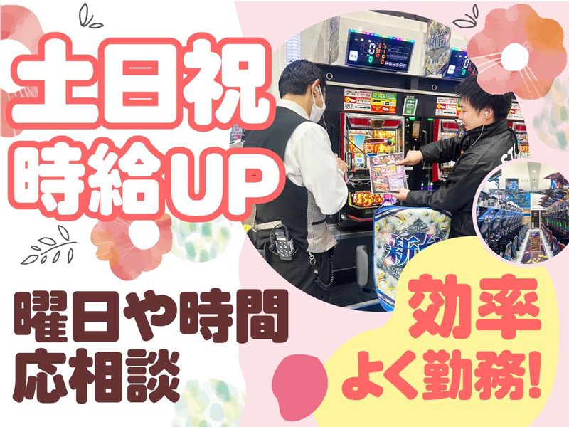 仕事内容 ୨୧┈┈┈┈┈┈ ・✦✦・┈┈┈┈┈┈┈୨୧ \主婦さん活躍中♪/週1日~OK◎ 家事・育児と両立しやすいお仕事! 自由シフト×おしゃれOKで快適勤務! 土日祝日は更に時給+100円アップ!! ୨୧┈┈┈┈┈┈ ・✦✦・┈┈┈┈┈┈┈୨୧ \無理なく働けて、しっかり収入も◎/  ̄ ̄ ̄ ̄ ̄ ̄ ̄ ̄ ̄ ̄ ̄ ̄ ̄ ̄ ̄ ̄ ̄ ̄ ⭐家庭と両立しやすい柔軟シフト⭐ ⭐最大時給1687円で安定収入⭐ 「久しぶりのお仕事で不安…」 そんな方も大丈夫◎ 未経験からスタートした スタッフが多数活躍中です♪ 入社後は基礎から丁寧に教える体制です。 店舗は広く、スタッフの人数も多め。 分からないことがあっても すぐに周りに聞ける環境です! ==================== ■仕事内容 ホールでの接客や カウンターでの賞品交換がメインです。 お客様のご案内や賞品の補充・陳列など、 決まった流れの中で動ける仕事が中心。 全台「各台計数機」完備のため、 重たい玉運びなどの力仕事はありません。 体力的な負担が少なく、 男女問わず長く続けられる環境です◎ ==================== ■職場の特徴 このお店の強みは 「働きやすさ」と「安定した収入」 が両立できるところ◎◎ 最大時給は1687円! また、シフトの自由度が高く、 週1〜5日の中で 自分の予定に合わせて働けます。 「短時間でしっかり稼ぎたい」 「子どもの行事や家庭の用事を大切にしたい」 などご自身のペースで 無理なく続けられる環境です! ==================== ■こんな方におすすめ *アルバイトでもしっかり稼ぎたい *家事・育児と両立したい *自分の時間を大切にしたい *おしゃれを我慢せず働きたい *一人で黙々と動くより、 チームで働く方が合っている ==================== 「しっかり稼げるのに、無理なく続けられる」 そんな“ちょうどいい働き方”が叶う職場です◎ 家事やプライベートを大切にしながら、 自分のペースで働いてみませんか? まずはお気軽にご応募ください♪