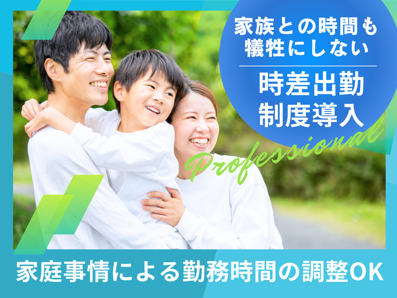 勤務時間詳細 実働時間:1日あたり8時間 平均勤務日数:1ヶ月あたり18日 〜 22日 8:30~17:30(実働8時間/休憩1時間) ※繁忙期でも残業は基本的にありません! ■時差出勤制度あり(育児支援) 子育て中の社員を対象に、「8:00〜9:30」の間で始業時間を調整できる制度です。 「保育園の送りをしてから9:30に出社」 「17時退社で小児科受診」など、ご家庭の都合に合わせた柔軟な働き方が可能です。 現在は2名のスタッフが、時差出勤制度を利用しています!