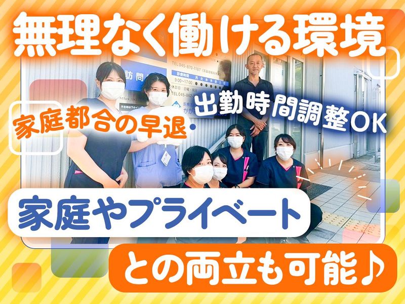 仕事内容 ▼▼ POINT ▼▼ ******************************** ⭐医療業界デビュー応援!初めての方OK! ⭐シフト柔軟◎働きたい日・時間を選択♪ ⭐土曜午後・日曜・祝日は必ずお休み◎ ⭐家庭都合の早退・出勤時間調整OK◎ ******************************** 未経験からの応募も大歓迎! 「医療業界で働きたい――」、 「会社のバックから現場を支えたい――」、 そんな意欲を持った方におススメのお仕事です! <お仕事内容> 耳鼻科クリニックでの 受付事務の業務をお任せします◎ >>具体的には? …………………………………………………… ▼受付業務(メイン業務◎) ・来院患者さまの受付・案内 ・初診/再診の確認、問診票の配布 ・保険証・医療証の確認(資格確認含む) ・予約対応(電話・WEB) etc... ▼状況に応じて診察の補助もお任せします! ・患者様の診察室へのご案内 ・検査準備 ┗カンタンな身長・体重測定や血圧測定など ・医師の指示に基づく器具準備 etc... 患者様の診察が円滑に進められるよう、 ドクターや現場スタッフを支えるポジションです◎ 日頃からコミュニケーションが活発! 相談や声かけが自然と飛び交うにぎやかな現場です♪ >>ママさん世代活躍中♪ …………………………………………………… 子育て奮闘中のママさんから、 お子さんが大きくなり子育てが落ち着いた ママさんまで幅広く活躍中◎ 「送迎に合わせて出勤時間を調整したい...」 「お子さんが体調不良で早退したい...」 「学校行事に参加できるようシフト調整したい...」 など、家庭と両立できるような環境を整えています♪ >>まずはできることから少しづつ♪ …………………………………………………… 先輩がしっかりサポートするので、 無理なくステップアップできます◎ あなたの成長に合わせて、 できることを少しずつ増やすことが出来る環境です♪ 【かがみとつかクリニックについて】 …………………………………………………… 私たちは患者様の声に丁寧に耳を傾け、 安心して頼れる医療を提供するクリニックです。 外来と訪問診療を通じて、 赤ちゃんからご高齢の方まで幅広く診療し、 通院が難しい方の生活も継続的に支えています。 地域に根ざした“かかりつけ医”として、 共に働くメンバーを新たに募集します!