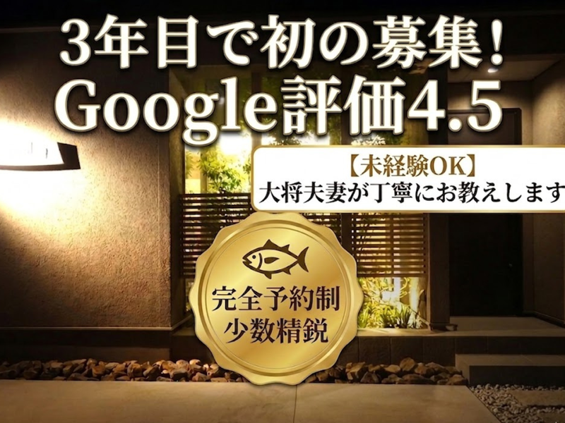 職場環境 Google評価4.5を誇る、隠れ家的な高級寿司店。大将夫妻が営む温かな雰囲気で、一人ひとりに寄り添う接客を学べます。予約枠を制限し、おもてなしの質を重視しているため、落ち着いて仕事に集中できる環境です。3年目を迎え、今回が初めての求人募集となります。