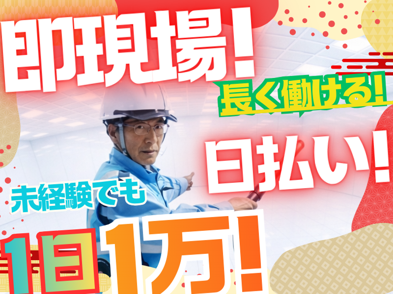 日給10,000円以上 給与: 【日当保障について】 ・勤務日に仕事が雨などでキャンセルになった場合でも、日給100%お支払いします!! ・早上がりでも1日分支給!