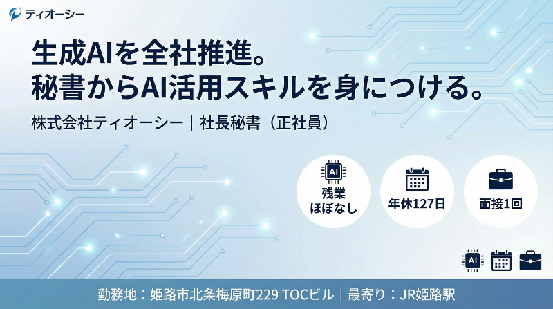 アピールポイント: 【アピールポイント】 ・定時退社が基本。残業はほとんどありません ・土日祝休み/年間休日127日で、プライベートと両立しやすい環境です ・面接1回のみ。選考がスムーズに進めば最短1週間で内定可能です ・体調不良など、当日の急なお休みも相談OK。状況に応じて柔軟に調整します ・勤務時間は9:00~18:00。社長の外出同行はなく、社内業務が中心です ・制服支給のため、毎日の服装に悩まず仕事に集中できます ・交通費は月3万円まで実費支給 ・JR姫路駅圏内で、自転車通勤・マイカー通勤も可能です ※業務効率化の一環として生成AIの活用にも取り組んでいます ※社員旅行(海外の場合あり)や社内イベントもあります