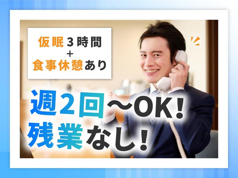 仕事内容 ■■■・。――――――――――――――― 勤務1回→夕方17時~翌朝9時迄(時間固定) 仮眠3時間&食事休憩あり ◎残業なし×プライベート充実◎ 月10回(勤務日数20日)の勤務で 月収18万円以上の高収入♪ ―――――――――――――――・。■■■ 「13時間勤務ってちょっと長すぎかも…」 とご不安の方もご安心ください! *しっかり3時間の仮眠で メリハリをつけて働ける! *合間に別途食事休憩あり♪ 前半はチェックインをはじめとする ゲスト対応、 仮眠を挟んで後半はPCでの入力作業。 翌朝にはチェックアウト作業と、 時間によっていろんな業務を行うので 「逆に暇すぎて時間たつの遅いなぁ」 ということもありません! 「気が付けばもう定時か!」 と残業ナシで帰れるのも魅力です♪ ほどよくお客様と話せて ほどよく一人の作業があるので、 飽きがきにくいお仕事! 月10回(勤務日数20日)の勤務で 18万円以上稼げるのも魅力の一つ♪ おかげさまで20代後半から30代の フリーターさんまで、 長く活躍してくれています◎ 翌朝の9時退勤で その日はスタートしたばかり! ゆっくり休むもよし、 モーニングで朝食も取るもよし、 朝から贅沢にお酒を楽しむのも良し。 思いおもいの時間をお過ごしできますよ♪ 「夜勤でガッツリ稼ぎたい」 という未経験の方も大歓迎! 英語スキルは必要ないので始めやすい◎ 【 仕事内容 】 ●チェックイン・チェックアウトの対応 ●お客様からの電話応対、予約受付 ●お客さまのご案内対応 ●施設内の案内やサービス提供 など ホテルのフロント業務全般をお任せ☆ お客さまの快適な滞在をサポートする 大事な役割をお任せしますが、 未経験からはじめたスタッフがほとんど◎ 仕事内容は簡単に覚えられますよ♪ もちろんイチから丁寧にお教えしますし、 先輩スタッフがしっかりサポートします! 【業務の流れ(例)】 17~19時 チェックイン・ゲスト対応 ▼ 19~24時 ゲスト対応・PC入力業務 ▼ 24~翌3時 仮眠・休憩 ▼ 翌3時~翌7時 PC入力業務 ▼ 翌7時~翌9時 チェックアウト・ゲスト対応 \ 合間で別途食事休憩あり!/ \ 男性スタッフ活躍中! /