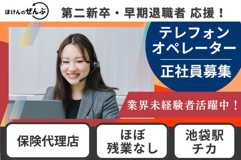【仕事内容】 \理想の働き方ができる☆/ 保険代理店本社のテレフォンオペレーターを正社員募集 《安定企業・ほとんど残業なし・週休2日制》 ▼第二新卒・早期退職者も応援▼ 働きやすさ抜群!安定基盤のグループ企業で キャリアを再スタートさせるチャンスです! ✨ジョブチェンジ制度で広がるキャリアパス ZENB HOLDINGSグループでは、マーケティング・人材・不動産 スポーツ・エンタメなど多彩な事業を展開しています 将来的には、あなたの興味や得意分野に合わせてグループ会社への異動・職種変更も可能! 「長く働ける」だけでなく、自分らしいキャリアを描ける環境が整っています ★上位役職へ挑戦できる「キャリアチャレンジ制度」もあります *‐*‐*‐*‐*‐*‐*‐*‐*‐* 未経験でも安心の理由! *‐*‐*‐*‐*‐*‐*‐*‐*‐* ■人物重視で採用中! 当社のスタッフは未経験スタートが90%以上! 初めての環境で不安な気持ちがわかるからこそ 先輩がしっかりサポートします♪ ■1ヶ月の配属前研修 入社後すぐに「お仕事をお任せ」なんてことはありません! まずはしっかりとした研修期間を設けてからスタート 業務の流れや必要な知識を習得後、安心してデビューできます! ■メンター制度で安心サポート 月2回、会社負担で先輩とランチやお茶を楽しむ機会を用意 一歩先を行く先輩が、仕事やキャリアの相談に親身に応じます *‐*‐*‐*‐*‐*‐*‐*‐*‐* 【テレフォンオペレーターのお仕事】 |安心ポイント♪ ①飛び込み営業や新規開拓なし! ②アンケートに回答いただいたお客様への案内なので、いきなり断られる心配なし ③カード会員様にはクレジットカード会社を名乗るのでスムーズに会話がスタート! |お仕事内容 保険商品のインサイドセールス(来店・対面はなし)をお願いします! ■お客様へお電話し、マネープランや保険に関するご相談内容をヒアリング ■保険商品(医療・がん保険など)をご案内・提案 ■お電話にて申込手続き・契約対応を実施 ■ご契約後のアフターフォローやお問い合わせ対応 ■ファイナンシャル・プランナー(FP)との面談のご案内 |配属先(お客様層がそれぞれ異なります) ①既存のカード会員様 ②以前に資料請求をいただいた方 ③TVCMを見てお問い合わせをいただいた方 *‐*‐*‐*‐*‐*‐*‐*‐*‐* テレフォンオペレーターの魅力Point♪ *‐*‐*‐*‐*‐*‐*‐*‐*‐* ✅ほとんど残業なし ⽉平均は10時間程度・週休2日制 ワークライフバランスも抜群です! ✅資格手当は100種以上 対象資格を取得すればするほど給与UP★ 対象者平均:月30,541円が支給されています! ✅給与UPのチャンスは随時 年功序列ではなく頑張りと成果に基づき給与を査定します 若くして管理職について活躍している社員も在籍しています ★アウトバウンド型保険テレマーケティング営業経験者(在職中)の⽅は 内定時に通常より高めの年収を提示しております ✅産休育休の取得率・復帰率100% ライフステージの変化にも柔軟に対応し、 キャリアを磨き続けるあなたを全力でサポートします ✅週末のリフレッシュ空間「ZENB Bar」 月に数回、会社のスペースがBarに変身! 軽く一杯を片手に、仕事の悩みや夢を気軽に語り合う時間を大切にしています *‐*‐*‐*‐*‐*‐*‐*‐*‐* 【職場環境について】 20代、30代からベテランまで幅広い年代が活躍中! コミュニケーションを大切にする社風があり 困った時は助けあい、切磋琢磨して働いています ☆オフィスは池袋駅より徒歩3分!帰りにショッピングなども楽しめる環境です 【会社について】 全国20拠点以上を展開する保険代理店です! 生命保険・損害保険を中心に40社以上の商品を提供 ZENB HOLDINGS傘下で9社のグループ会社を持つ安定基盤のもと、 2025年10月1日に『ホワイト企業認定』を取得しました 今後も従業員の家族からも応援される企業を目指してまいります ─────────────── 少しでも弊社のテレフォンオペレーターにご興味をお持ちの方 是非お気軽にご連絡下さい!