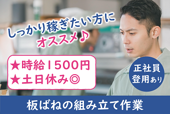 仕事内容 \\エリア高時給1500円!!//しっかり稼ぎたい方にオススメ☆土日休みでプライベート充実◎未経験者歓迎♪ <仕事内容> 自動車、電車に使われる板ばねの製造になります。 主に板ばねの組立をして頂きます。 コンベアを挟んで両側に立ち2人1組でラインの中で作業を行います。 主な作業は3つあり、適性や欠員状況から判断し決定します。 1.金属の板状の部材を重ねる作業。 2.部材の真ん中の穴に棒を差し込む作業。 3.ねじを締め部材を組み立てる作業。 立ち作業でのお仕事です。 重量物を扱う(15㎏以上)可能性がございます。 グループ作業となります。 《職場環境》 男性が多い職場です。 ロッカー有り|休憩室完備 アピールポイント <仕事内容> 自動車、電車に使われる板ばねの製造になります。 主に板ばねの組立をして頂きます。 コンベアを挟んで両側に立ち2人1組でラインの中で作業を行います。 主な作業は3つあり、適性や欠員状況から判断し決定します。 1.金属の板状の部材を重ねる作業。 2.部材の真ん中の穴に棒を差し込む作業。 3.ねじを締め部材を組み立てる作業。 立ち作業でのお仕事です。 重量物を扱う(15㎏以上)可能性がございます。 グループ作業となります。 《職場環境》 男性が多い職場です。 ロッカー有り|休憩室完備 \充実した福利厚生/ ◎社会保険・雇用保険完備 ◎有給休暇有(6ヶ月経過後、10日付与)※規定あり ◎残業手当 ◎交通費支給(規定内) ◎確定拠出年金制度 ◎週払い制度(週3回対応) ◎お友達推薦制度あり(規定有り) ※1名につき3万円~10万円臨時給与として支給 ◎車(マイカー)・バイク通勤可(無料駐車場あり) ◎食事持参可、日勤シフト時のみ仕出し弁当あり ◎社員食堂あり(定食420円程度) ◎作業着貸与 ◎ロッカー・休憩室利用可 ◎正社員登用制度あり ◎福利厚生プログラム (宿泊、グルメ、ショッピングなど大幅割引が受けられる10万アイテムのメニューがあります。)
