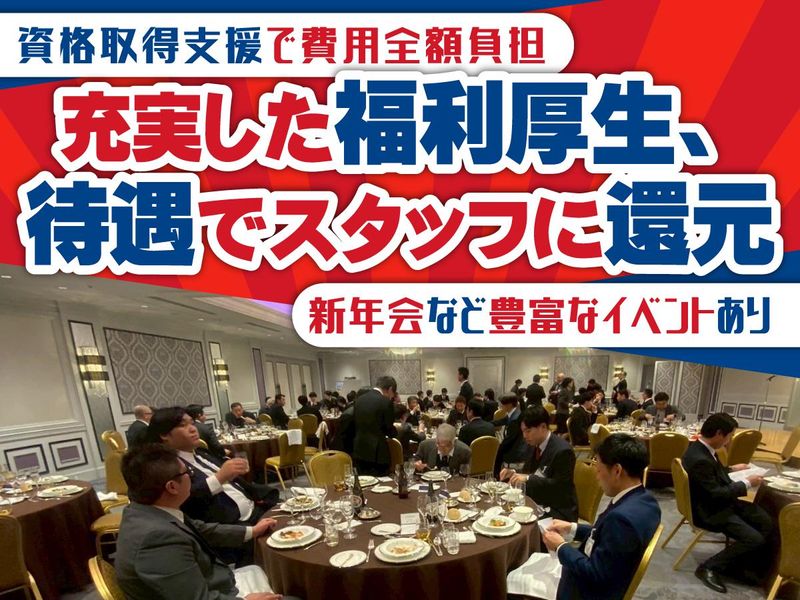 職場環境 今年の新年会はホテルで立食パーティを開催したりなど、イベントも盛りだくさん◎ 日々の頑張りを労う催し物や充実した福利厚生があるからこそ、「ここで長く働きたい」と思ってくれる社員は多いです。 仕事のオンオフを大切にしながら、会社の成長に貢献していきましょう! 喫煙所:なし(敷地内全て禁煙)