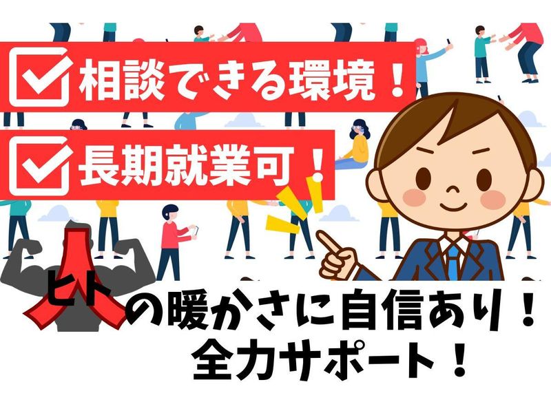 職場環境 寮・社宅完備|30代活躍中|20代活躍中|男性活躍中|経験者優遇|長期休暇あり|駐車場完備|バイク通勤OK|マイカー通勤OK ●就業先の雰囲気も良く、コンプライアンスが守られており、何でも質問しやすい環境です。 喫煙所:喫煙所あり(屋内)