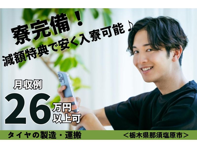 仕事内容 【 応募から2週間程度で内定可能! 】 《 ここがポイント! 》 ◎社員寮あり、入寮応相談 ◎月収26万円以上可能 ◎20~30代男性活躍中の安定現場! 《 仕事内容 》 自動車やバイクのタイヤ製造工場での製造・運搬作業です。 原材料、部品、製品(10~20kg)を各工程へバッテリーカーで運搬します。 【 担当業務 】 ●運搬 …加工・成型・検査工程へ供給 ●加工・製造 …ミキサーでのゴム混合、ナイロン補充・マシン補助 ●裁断・成型 …サイズに合わせ裁断・加熱(ボタン操作) ●検査 …1本ずつ品質チェック(硬さ・亀裂など) その他、機械操作や補助作業もあります。 《 体力自慢におすすめ! 》 身体を動かす仕事で健康的!体力も付けられます。 《 黙々と仕事を進める工場! 》 イレギュラー対応なし!集中型の作業が得意な方に最適。 《 熱中症対策しています! 》 スポットクーラー・電動空調ベスト支給・ドリンク支給あり! 《 寮費減額あり 》 寮費15,000円減額(規定あり)。 家具家電付き1K寮あり。 《 充実の工場周辺 》 周辺にコンビニやスーパーあり!生活も便利♪