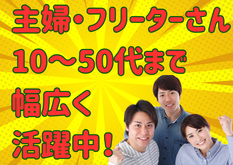 求めている人材 経験・スキル不問! 未経験歓迎! 主婦(夫)・パートさん活躍中 学生・フリーター活躍中 WワークOK ブランクOK 扶養内勤務OK 幅広い年代の方活躍中! 【こんな方にオススメ】 ・コツコツ作業が好きな方 ・Wワークしている方 ・短時間だけ働きたい方 ・久々にお仕事復帰したい方 ・接客なしのお仕事がしたい方 ・難しいくないシンプルワーク希望の方 ・自宅近くで働きたい方