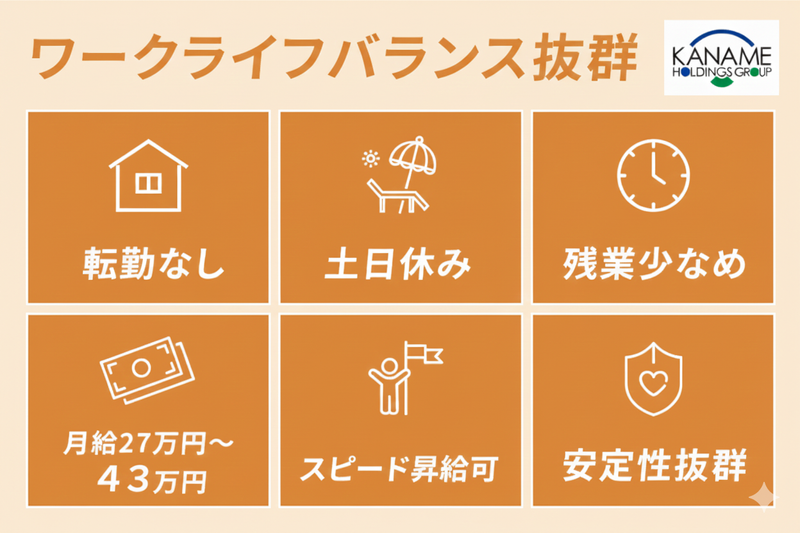 仕事内容 ================ 経理経験を活かして管理職へ ================ 安定基盤を持つホールディングス本部で、 将来の経理マネージャー候補としての採用です! 創業50年以上のグループを支える 中核ポジションで、活躍してみませんか? ―――――――――――――― 【ポジションについて】 ホールディングス本部および基幹事業会社にて、 経理業務全般を担当していただきます。 実務だけでなく、組織運営や 管理会計にも関われる環境で、 将来的にはマネージャー・部長クラスの 管理職も視野に入っています。 ―――――――――――――― 【求める人物像】 ◆経理経験を活かし、キャリアを高めたい方 ◆主体的に業務を進められる方 ◆管理職を目指して年収UPを狙いたい方 ◆安定企業で長く働きたい方 ◆日商簿記2級以上をお持ちの方も歓迎 周囲のサポート体制も整っており、 分からない業務はフォローしながら進められる環境です。 ―――――――――――――― 【具体的な仕事内容】 ◆請求書作成・会計ソフトへの入力 ◆給与計算 ◆経理関連業務全般 ◆税務申告(法人税・消費税) ◆総務関連業務 など 経理を中心に、幅広い分野に携わることで 確実にスキルアップできる業務構成です。 ―――――――――――――― 【職場の特徴】 定着率が高く、風通しの良い環境! 30~40代の即戦力採用を想定し、 「管理職を目指したい」「実務を広げたい」という方に適しています。 ―――――――――――――― 【働きやすいポイント】 ・完全週休2日制/残業少なめ ・車通勤OK(無料駐車場あり) ・夏季/冬季休暇あり ・年収500万円以上可(昇給あり) ・コーヒー飲み放題 働きやすさと安定性の両立を重視しています。 ―――――――――――――― 【会社について】 カナメ・ホールディングスは食料品流通を中心に、 9つの企業で構成されるホールディングスグループ。 創業50年を超える安定基盤を持ち、 景気に左右されにくい体制を築いています。 長く腰を据えてキャリアを築きたい方に適した環境です。 【弊社HP】 https://kaname-holdings.co.jp/