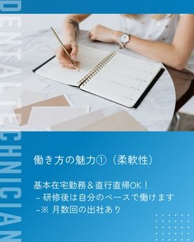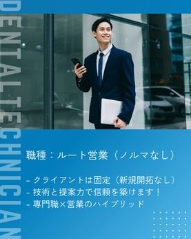 資格 【必須】 歯科技工士・歯科衛生士資格 普通自動車免許※ペーパー不可 ★定期訪問先への移動はすべて車で行うため、カーシェアやレンタカーを利用していただきます ★自家用車使用についは相談可能です