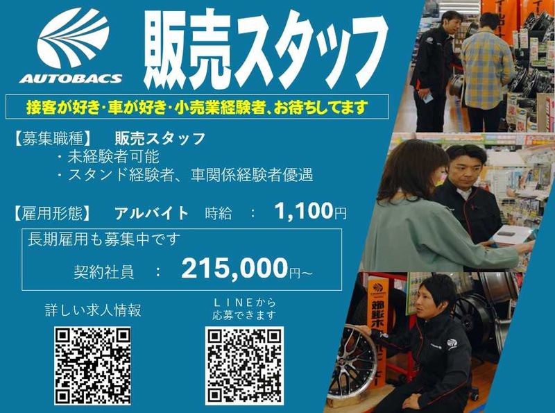 仕事内容 業務拡大|オートバックスでの最大手カー用品店での店内販売・売場管理スタッフ|パート・アルバイト|新札幌 幅広い年齢層が活躍中!経験も年齢も不問です! コマーシャルでもお馴染みの「オ~トバックス♪」で 接客、店内販売業務をお願い致します! \未経験OK!先輩スタッフがサポートします!/ 接客ノウハウやクルマに関する知識、作業の基本は 入社後に先輩スタッフが優しく丁寧に指導します。 お客様に商品の説明を行ったり、質問にお答えしたりする業務です。 その他の接客業務もお願い致します。 お客様とコミュニケーションをとり、企業の顔となるとても大切なポジションです。 最初はわからないのが当たり前ですので、スタッフ全員があなたを全力でサポートします! 未経験でも安心して勤務して頂けます! <接客>お客様からの質問への応対、商品の仕様や使用方法説明、など <店内販売>レジ応対、商品ディスプレイ整理、売り場づくり、など ※スキルアップにより昇給も可能です。正社員登用の実績も多数! アピールポイント <安定の働きやすさ> ◆カー用品をお得に購入できる社員割引有り♪ ◆シニアも含め、幅広い年齢層が活躍中! ◆主婦(夫)も活躍中!扶養内勤務OK! 腰を据えて長く働きたい方、家庭と両立して仕事をしたい方、 ぜひ一緒にオートバックスで働きませんか♪ 皆さんと働けることをスタッフ一同、心より楽しみにしています! ___________________________________ 【LINEでの応募はこちらから!】 当社を友達追加をしていただくことで、「応募」となります。 その後トークルームで、どの求人(職種・店舗・雇用形態)をご覧になったかをお送りください。求人についての問い合わせも、LINEをご活用ください!