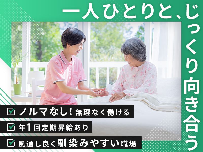 アピールポイント 【特徴&求人の魅力】 ●特徴01|無理なく働ける ノルマなどはなく、日々の仕事量も 落ち着いています。 チームではなく、基本的に一人で担当し、 裁量が大きいため、自分のペースで のびのび働けますよ。 ●特徴02|人間関係良好 年齢の近いスタッフが多く、 親しみやすい空気感があります。 また、利用者様との距離も近いため 確かな信頼関係を築けるでしょう。 ●特徴03|サポート体制充実 初めての事態や緊急時にも きちんと対応する体制があり、 安心して働ける環境です。