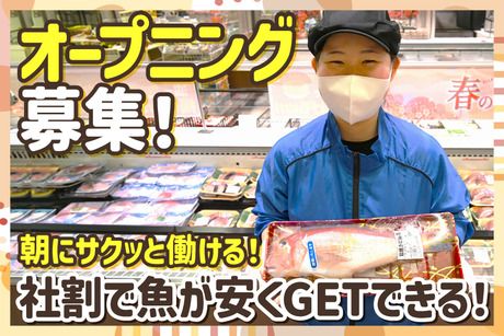 仕事内容 アピールポイント *<10月中旬オープン!オープニングスタッフ募集>* *<大型採用で同期がたくさん!上下関係なくフラットにスタートができる!>* *<未経験でもスグできる!モクモク作業でめちゃ簡単♪>* *<スタッフ割引で美味しいお魚を食卓にも!>* *<早朝~11時or12時までの午前のみ!>* *<午後は自由に過ごせる♪家事や趣味の自分時間もたっぷり!>* 【お仕事内容】 お任せするのは・・・簡単なお寿司作り! 調理経験はなくてもOK!気軽に始められます! \POINT/ ◆白ご飯にネタを載せるダケでOK◎ シンプル作業で覚えることは少なめ! ◆1日4~5名の少人数制! 困ったときはすぐに相談できます◎ ◆接客なしのモクモク作業! 周りを気にせずコツコツお仕事できる環境です◎ *【慣れるまでしっかりサポート】* 資格や経験は不問! スーパーならではの仕事の進め方などは徐々に慣れて頂ければOK! 飲食出身で、小売店勤務が初めてという方も わからないことは気軽に相談してくださいね。 安心してお仕事に取り組めるよう、 周りのスタッフがしっかりフォローします。 *【ニオイの心配は要りません!by40代主婦さん】* 「正直、入るまでは鮮魚って生臭いイメージでしたが、 そんな心配はご無用!切り身の魚ばかりなのでほぼ気になりません! 制服もありますし、仕事後そのままスーパーで買い物して帰る なんてスタッフもたくさんいます! それよりも新鮮なお魚がスタッフ割でゲット出来ちゃうのが嬉しいです!」 - 「面接」ではなく「面談」を10~15分で予定しております! あなたの人柄を知るために色々と雑談のようなお話ができればと思っております! 当日は私服OK!普段通りリラックスしてお越しください!