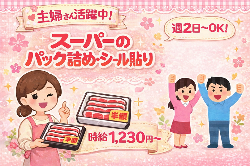 仕事内容 \\40代・50代の主婦さん活躍中!// ✨16時退勤で夕飯の準備にも間に合う 家庭と両立しながら働けます♪ ✨接客ほぼなし コツコツ作業が中心のお仕事です ✨お肉のパック詰め・シール貼り中心 難しい作業はありません◎ ✨子育てが落ち着いた方の パート復帰にもおすすめです! ✨日曜・祝日は時給1330円! 安定してしっかり稼げます◎ ✨駅チカの好立地 大口駅から徒歩4分で通勤ラクラク♪ ・。★―――――――――――――――― 《 仕事内容 》 スーパーの精肉コーナーでのお仕事! ✅お肉の簡単なパック詰め ✅値札シールの貼付 ✅品出し・整理整頓 など 作業はとてもシンプルで コツコツ進められるお仕事です。 接客はほとんどないため 「人前に出る仕事は少し不安…」 という方にも安心の環境です。 最初は先輩スタッフが 一つずつ丁寧にお教えします。 久しぶりのお仕事復帰という方も 安心してスタートできます◎ ――――――――――――――――★。・ 現在は40代・50代の主婦スタッフが 多数活躍しています。 「子育てが落ち着いたので そろそろパートを始めたい」 そんな方にもぴったりの職場です。 勤務は8:00~16:00なので 夕飯の準備にも間に合います。 家庭と両立しながら 無理なく働ける環境です◎ ・。★―――――――――――――――― さらに魅力的な福利厚生♪ 家族手当制度や 賞与のチャンスもあるため 安定した収入を得ながら 長く働ける環境です◎ ――――――――――――――――★。・
