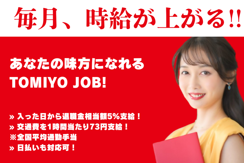 ■応募後の流れ *【 ご応募・お問合せ 】* 「応募画面へ進む」ボタンからカンタン1分応募 氏名、メールアドレス、電話番号などを入力して応募完了! 求人のお問い合わせだけでも構いません、 お気軽にご連絡下さい! ━━━━━━━━━━━━━━━━━━━━━ *【 応募後の流れ・選考プロセス 】* 1.Indeedから応募 ↓ 2.求人の詳細などご連絡させていただきます。 ※ご質問がございましたら遠慮なくお申し付けください。 ↓ 3.面接(リモートOK)、職場見学も可能です。 ↓ 4.内定・入社 ※応募~内定まで最短で即日、 通常では1週間程度を予定しています。 ※入社日も相談に応じますので、お気軽にご応募ください!! ////////////////////////////////////////// 「この求人、なんだか違う気がする…」 「自分に合っているかどうかわからない…」 など、少しでも不安や疑問がある方へ。 TOMIYO JOB!では、皆さまにピッタリの お仕事を無料でご紹介しています。 まずはお気軽にご連絡ください! 【お問い合わせ先】 株式会社TOMIYO JOB(トミヨジョブ) TEL:0120-1034-67(平日9:00~18:00) ━━━━━━━━━━━━━━━━━━━━━ <TOMIYO JOB!ならうれしい特典がいっぱい> POINT1:毎月、時給が2円ずつ上がり続ける! POINT2:入社したその日から退職金相当額5%を支給 POINT3:交通費を1時間当たり73円支給 POINT4:希望の方には日払いも対応可能! ※1stエントリー対象の方は、POINT1(毎月2円昇給)が適用されませんのでご注意ください。 \動画でTOMIYO JOB!を知る/ https://youtu.be/UMLrzteO3X0 ━━━━━━━━━━━━━━━━━━━━━ 【 事業内容 】 労働者派遣事業、有料職業紹介事業 ※労働者派遣事業 許可番号/派 40-010237 ※有料職業紹介事業 許可番号/40-ユ-010110 ━━━━━━━━━━━━━━━━━━━━━ ■応募受付電話番号 092-471-1034 ■個人情報の取扱いについて ご提供いただいた個人情報は、採用選考及び結果等の通知・連絡の為に利用いたします。 それ以外の利用目的または法令等に基づく要請の範囲を超えた利用はいたしません。