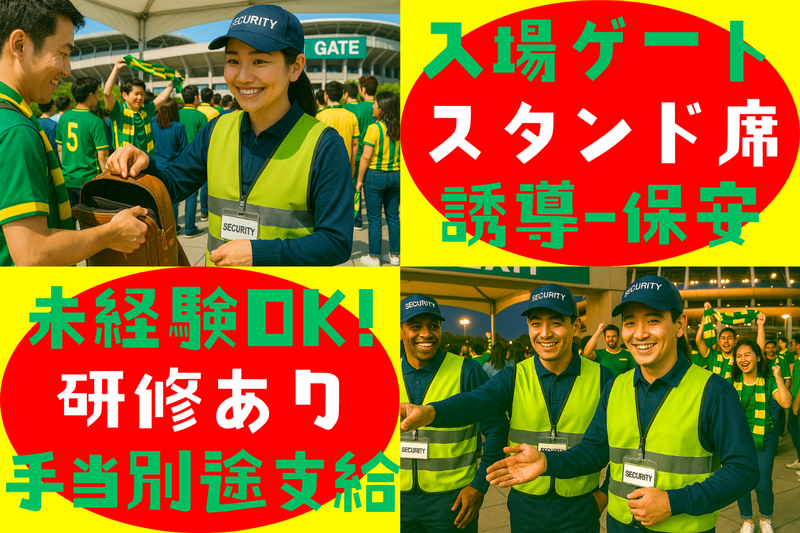 仕事内容 *年齢不問・週払い・交通費全額支給* !!ゴールデンウィークのバイトはコレ!! 2026年シーズン!! 百年構想リーグホームゲームの試合会場セキュリティ、 増員につき追加の新規メンバーを大募集です! プロサッカー試合会場のセキュリティスタッフとなります。 千葉市内のサッカースタジアムにて、試合開催日のセキュリティ全般を担当します。 白熱の試合を支える大事なお仕事です! 募集するのはゴールデンウィーク初日、 4/29(水)に開催予定のホームゲーム! 試合開催日だけの単発シフトです。 もちろん年間通しての長期希望も大歓迎!! (勤務日はJリーグ試合に艇による) [お任せする仕事内容] ・スタジアム周辺での来場者誘導 ・ゲートでの手荷物検査 ・スタジアム内でのパスチェック などなど プロスポーツの現場に関わる、やりがいに繋がる仕事です。 「こちらから列にお並びください!」 「お手荷物を確認させていただきます」 「こちらは関係者以外立ち入り禁止です!」 「押し合わず、ゆっくりお進みください!」 などなど、 お客様へお声がけをお願いします。 [社会人経験が浅い方も大歓迎!] ほとんどの方が未経験から始めているのでブランクがある方も、初めての方もご安心ください。 事前に研修があり、じっくり学んでからデビューができます! もちろん勤務当日は担当リーダーや先輩がフォロー! 未経験でもご安心ください。 [こんな方も大歓迎] ・ガッツリ副業は厳しいけど、たまに週末だけ働きたい ・転職/就職活動のワンクッションにちょっとだけ ・冬休みのアルバイト、やったことないけど何か始めたい ・サッカー大好き!好きに係わる仕事をしてみたい 日払いも可能!! ゴールデンウィークで「もうちょっとお小遣いが足りない」なんていう時も、 事前申請しておけば、その日に現金が受け取れちゃう! そんなに急いでない方にも、お給料は週払い! 毎週水曜日が給料日!! さらに当業務終了後にも長期間勤務いただいた方には ちょっと嬉しい♪「ボーナス5万円」支給アリ! ※規定有 交通費全額支給、週払い、食事支給あり、日給保証などなど 皆さんの働く意欲をサポートします!! [注意] 警備業のため、事前に必ず3回の初任研修を受講していただきます。 詳しくはご応募の際にお問い合わせください。 事業内容 請負業・警備業