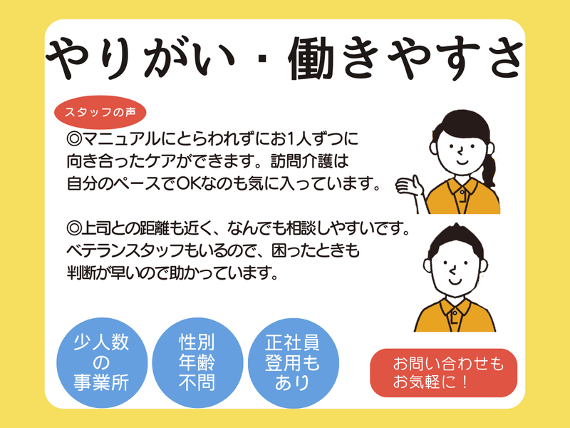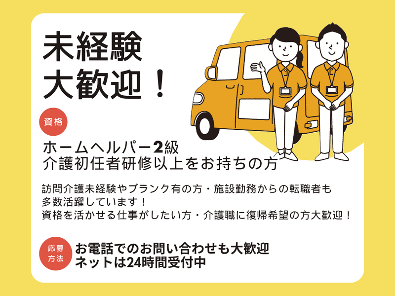 求めている人材 ・学歴・経験不問 ・未経験OK! ・主婦(夫)歓迎 ・フリーター歓迎 <必須> ホームヘルパー2級以上または介護初任者研修以上 <歓迎> ホームヘルパー1級、介護福祉士、介護実務者研修 ☆ブランクがある方や、実務未経験でも大歓迎!