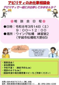 仕事内容 【派遣先のおススメ3ポイント】 (1)選べる固定勤務で自分に合った働き方が可能! (2)経験不問の組立作業です。 (3)男性・女性ともに活躍されている職場です♪ 【具体的な仕事内容について】 半導体製造装置などに使用される、 手の平サイズの軽量パーツの組立作業です。 ▼主な業務例▼ ・パーツに部品を乗せる作業です 重量物はありませんので、無理なく働けます! - 詳しい内容等、 お気軽にお問い合わせください! 【職場環境について】 ※男性・女性ともに活躍されている職場です。 ※空調完備の快適空間でのお仕事! ※増産のための募集です 【派遣先について】 増員募集!将来的な業務量増加に向けて 新しい人材採用を目指しています♪ 派遣先は、京都と阿蘇を拠点とした 精密機械の組立メーカーです。 阿蘇郡西原村大字鳥子の工場内にて 仕分け作業を担当して頂きます。 【アビリティは、「熊本・荒尾・久留米・長崎」に事業所を展開中!】 「製造・専門技術/事務・接客・サービス/物流・倉庫・軽作業」 など多種多様な職種を紹介します。 更に、熊本では「光の森JOBセンター」を開設し、 各事業所では定期的なお仕事相談会を実施中。 私たちはお仕事紹介だけでなく、今後のキャリアの悩みなどの相談も 全力でサポートします!