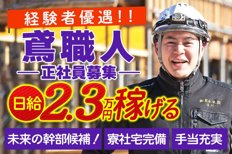 【仕事内容】 《日給2.3万稼げる・寮社宅あり・残業なし》 建設会社で建築スタッフを正社員募集! \岩永建設ってどんな会社?/ 「手厚い研修体制」「徹底した安全対策」「公正公平な評価制度」の3つの強みを軸に 一人一人のやる気と実力を評価し給与に還元している会社です 【仕事内容】 建設足場現場において、高所作業に鳶職として携わっていただきます (新築のマンション、ビル、学校、病院、老人ホーム等) 頑張った分だけ給料が上がる☆ 年齢に関係なく出世も可能!40代の方も積極的に採用中! 30代で親方になっている建築スタッフもいます! ───────────────── 建築スタッフのおすすめ6つのポイント ───────────────── ①職人経験活かせる ②残業なし・週休2日相談OK ③寮社宅(生活家電・Wi-fi)完備 ④直行直帰可 ⑤髪型・髪色自由/タトゥーOK ⑥熱中症対策として状況に応じて差し入れ ───────────────── |20~30代の若い世代が活躍中! 建築業界は年々高齢化が進んでいますが、 岩永建設は平均年齢が若いのが魅力♪ 年齢や役職関係なく風通しのよい雰囲気作りをしています 社内の雰囲気はこちらでチェック ☆Instagram@iwanagakensetsu ☆TikTok@iwanaga0519 |キャリアアップを全力応援! ■1、2年目…経験を活かして働きながら新入社員への技術指導もお願いします ■3年目…チームの中心として動きながら、中間管理職の立場を学びます ■4年目…チームリーダーとして職長の仕事を学びます 入社後は、以下4つの資格を会社負担で取得していただきます! (※1年未満で退職された場合、費用をご負担いただく場合があります) ∟足場作業・フルハーネス・高所作業車・酸素欠乏危険作業 また、スキルアップや業務成長に応じて、以下の資格取得もサポート♪ ∟玉掛け・クレーン・職長 など 【給与】 経験者日給:1.7万~2.3万円 (スキル経験による) ★月給目安:44.2万~59.8万円 ※26日計算 ★年収目安:530.4万〜717.6万円 ※未経験者は日給1.4万円~(月給36.4万円~※26日計算) 建設経験者応援! 直接話を聞きたい方や応募はまだ…という方でも 建築スタッフにご興味持たれましたら、ご連絡ください! 当社は「未来の従業員」も「現在の従業員」も大事にしています