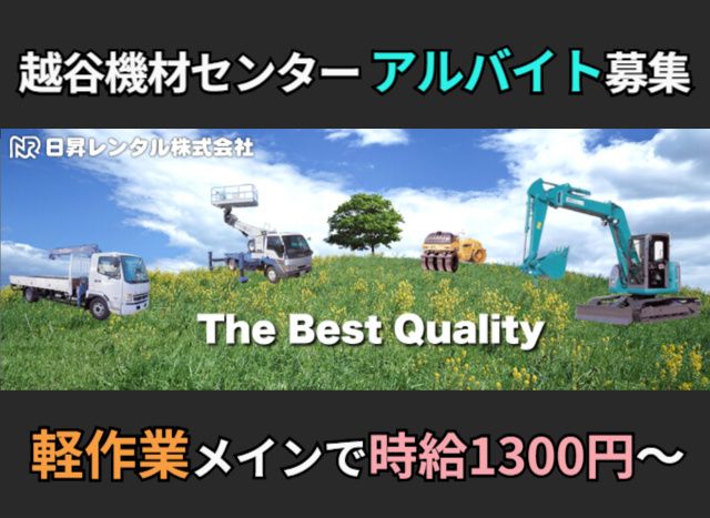 職種補足 【軽作業スタッフ】土木建築機材等の洗車・清掃整頓・入出庫・車両移動業務 雇用形態 アルバイト・パート 備考 弊社『日昇レンタル株式会社』は、 高所作業車、土木建設機械、運搬機械等のレンタルと作業服、ヘルメット、安全靴、工事標識、工事黒板、保安用品、現場イメージアップ商品等の販売をしている会社になります 本社を北海道に構え、事業所は北海道に3拠点、関東に4拠点ございます。 様々な商品を扱っており、建設現場での一役を担っております。 昭和55年の設立時より、多くのお客様に支えられ躍進してまいりました。 更なる飛躍の為にこの度はスタッフを募集いたします。 社会保険 労災保険あり 試用期間 なし 喫煙環境 屋内禁煙(喫煙所あり) 受付先名 日昇レンタル株式会社 越谷機材センター 〒343-0825 埼玉県越谷市大成町2-48-1 TEL:048-990-0200