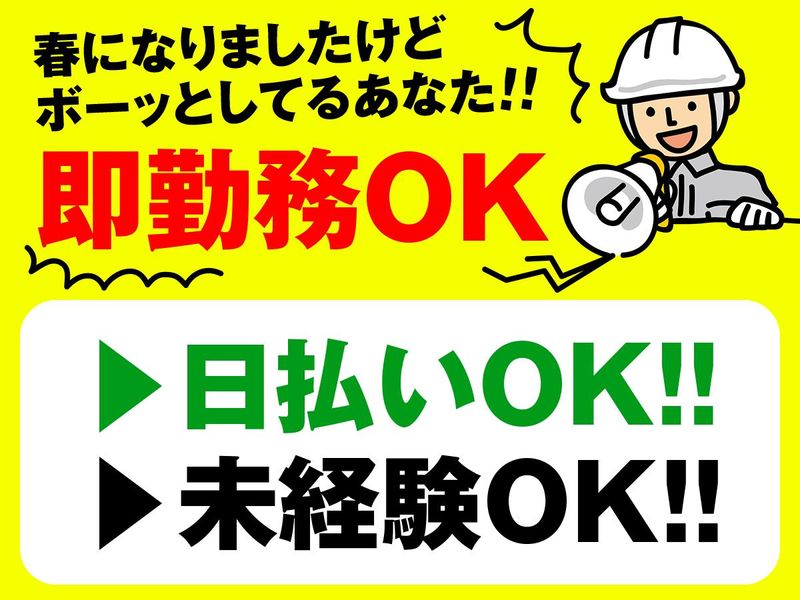 求めている人材 現場未経験の方やアルバイト未経験の方、大歓迎です! 稼ぎたい・Wワーク等活躍しています! \いずれかあてはまる方優遇/ ✨現場での勤務経験者の方 \建設現場の軽作業スタッフ募集/ ✨すぐに働きたい方▶即日勤務できます! ✨すぐにお金が欲しい方▶日払い・週払い可能! ✨先の予定を決めたくない▶前日午前中に翌日の勤務を決められる! \面倒見の良い会社です/ 営業所内勤さんは多趣味の方がたくさんいます。 仕事が終わって作業員さんが営業所に帰ってくると食事・スポーツ・健康・映画などの話題で盛り上がっています! 手厚いサポート体制の当社で活躍しませんか? \こんな経験も活かせます/ ※必須条件ではありません ●電気工事、電気通信工事、電気施工管理、電気設備などの電機関連工事経験 ●型枠大工、リフォーム大工、木造大工、宮大工、一人親方など各種大工経験 ●型枠、型枠解体、住宅鉄筋工などの解体・鉄筋工事経験 ●クロス職人、内装解体、内装工、床工事、防水、現場作業員、リフォーム、設備工事、水道工事、排水管清掃、水道メンテナンス、設備多能工などの内装関連の工事経験 ●土木作業員、土木工事、鳶、足場とび、鉄骨とび、鳶職、鉄骨工事、現場作業員、グラウト工事、地盤改良、土壌調査、宅地造成などの基礎工事関連 \活かせる資格/ ※必須ではありません ●重機オペレーター など \活かせる業界経験/ ※必須ではありません ●建設業・建築業 ●土木業 ●防水業 ●電気工事業 など 建設に関するお仕事経験のある方も、まったくの異業種出身(飲食や製造、ドライバーなど)の方のご応募も大歓迎です!