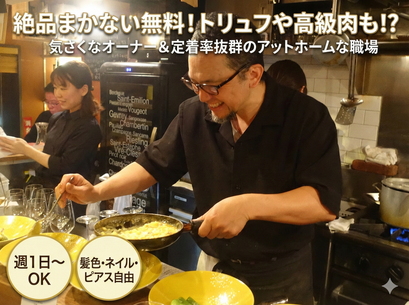 仕事内容 \ スタッフの定着率抜群♪ / 個人店だからこその居心地の良さ◎ ☆+..+☆+..+☆+..+☆+..+☆+..+☆ ✅週1日~OK!フリーターさん大歓迎! ✅まかない無料!高級食材も食べれちゃう★ ✅髪色・ネイル・ピアス自由!オシャレOK ✅居心地良さ抜群!アルバイトから正社員になった方もいます♪ ☆+..+☆+..+☆+..+☆+..+☆+..+☆ まるで隠れ家! 個人店のイタリアンレストランで働ける! 【仕事内容】 9席のみなので、お客様との距離が近く会話を楽しみながらゆったりとお仕事ができます♪ 「大きなチェーン店より、顔の見える個人店で働きたい」 「お客様との会話を楽しみながら、本格的な知識も身につけたい」 そんな方にぴったりの環境です◎ ~具体的には~ *料理の提供 *食器下げ、片付け *盛り付け補助 *お客様に料理などの説明 \個人店で働きたい方に!/ ①「また食べに来たよ~!」が嬉しい距離感✨  ̄ ̄ ̄ ̄ ̄ ̄ ̄ ̄ ̄ ̄ ̄ ̄ ̄ ̄ ̄ ̄ ̄ ̄ ̄ ̄ 全9席という小さなお店だからこそ、お客様との距離が近いのが特徴。40〜60代の落ち着いたお客様が多く、顔見知りになることも。 「今日も美味しかったよ」という言葉を直接いただける、やりがい十分のお仕事です♪ ②働きやすさもバツグンです✨  ̄ ̄ ̄ ̄ ̄ ̄ ̄ ̄ ̄ ̄ ̄ ̄ ̄ ̄ フリーターさん多数活躍中★ 週1日からOKで、本業の都合もしっかり考慮。しっかり稼ぎたい方も大歓迎!シフトは柔軟に対応します! また、髪色・ネイル・ピアスも自由!華美すぎなければ自分好みのオシャレを楽しみながら働けます♪ ③「食」の楽しみが詰まってます✨  ̄ ̄ ̄ ̄ ̄ ̄ ̄ ̄ ̄ ̄ ̄ ̄ ̄ ̄ ̄ ̄ まかないは、お客様にお出しするメニューと同じ! カルボナーラやニョッキ、時にはトリュフや高級なお肉がでてくることも…!?300種類のワインを試飲する機会もあり、働きながら自然とワインに詳しくなれますよ★ \ 店長はこんな人! / 「うちで働くなら、とにかく働きやすい雰囲気を作りたい!」という、とっても優しくて陽気な店長です。スタッフ想いの店長だからこそ、定着率が抜群なんです♪ その居心地の良さもあって、アルバイトから正社員になったスタッフがいます! もともとは他のお仕事と掛け持ちで働いていましたが、「ここでの仕事が一番楽しい!」と、このお店一本に絞ってくれました☆
